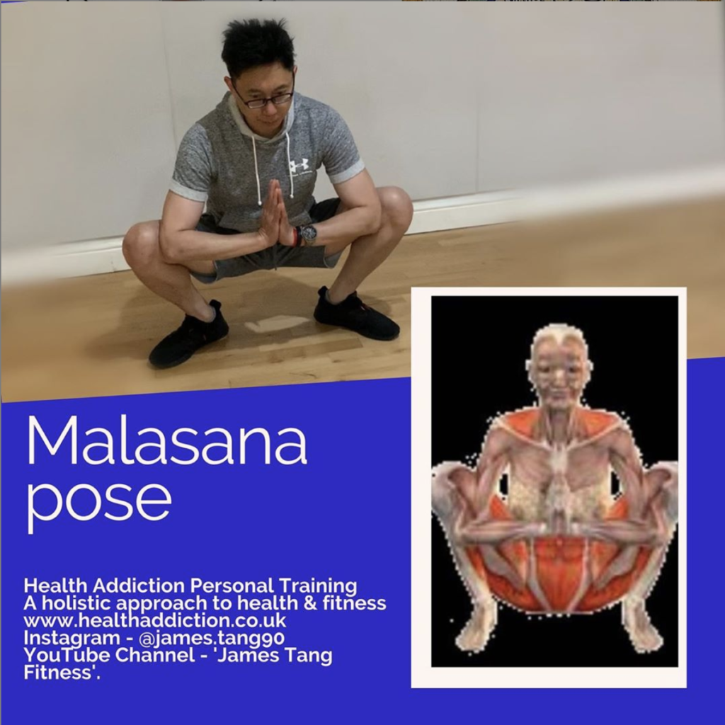 Malasana refers to a wide-footed, deep squat – also referred to as garland pose or upavesasana.