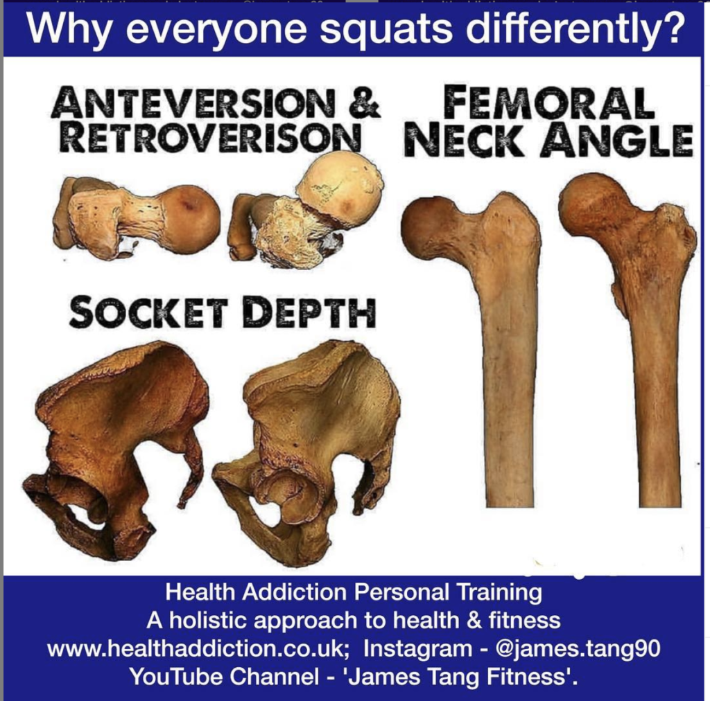 When someone has difficulty squatting, or their feet turn out, or they like a wide stance, we need to consider the anatomical variations of their hip joint. Happy squatting.