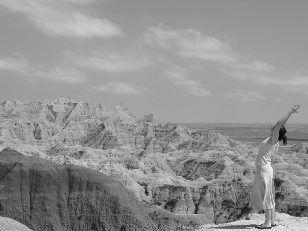 This iconic shot features one of our long ago students, Sara, when she was in the Badlands. Note: The pose may also be done with both palms pressing towards and supporting the lower back – also shown below.