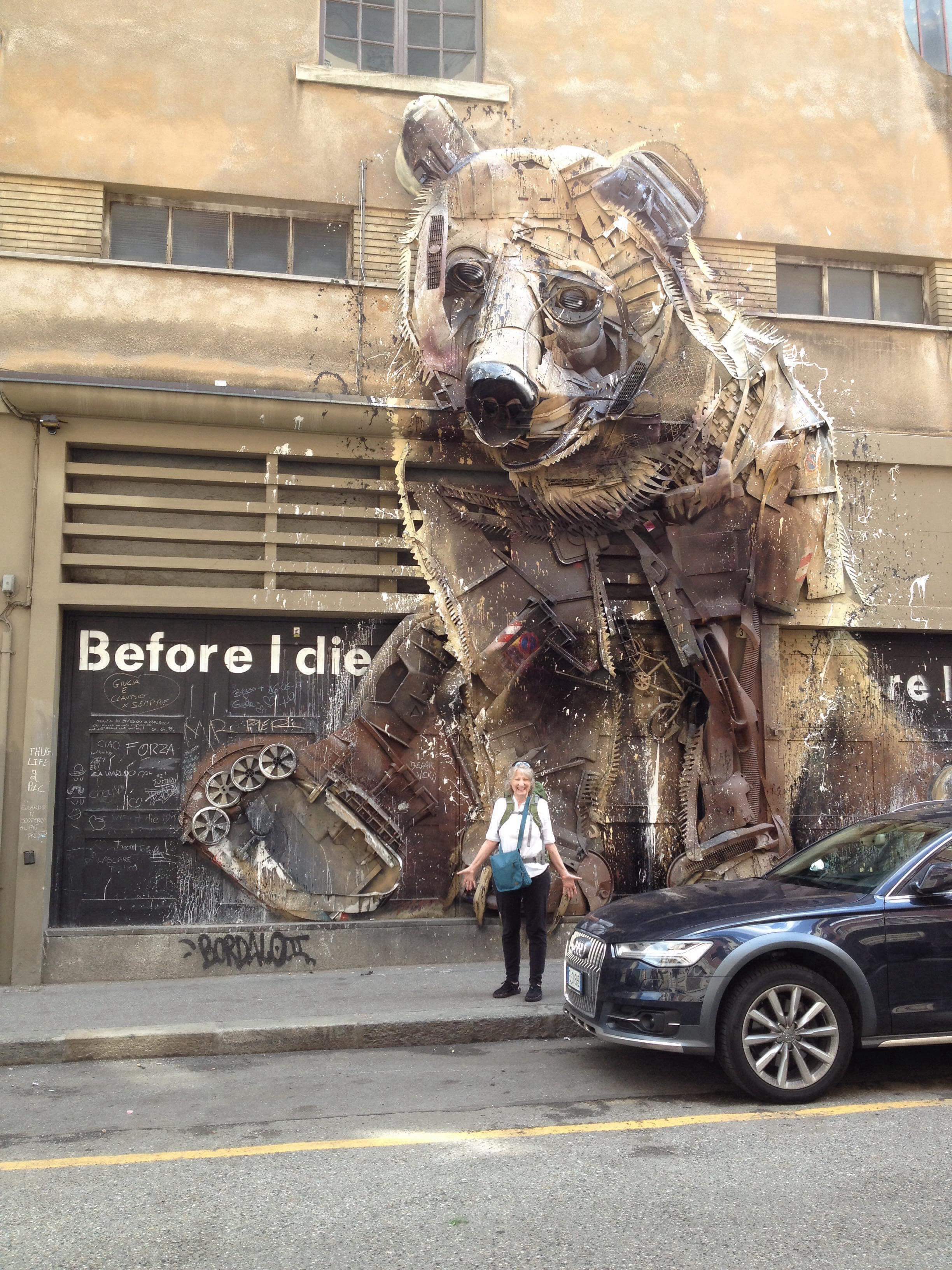 Hello from Italy! Saw this bear on a street in Turin -he is made out of junked car parts and I am in love with him!