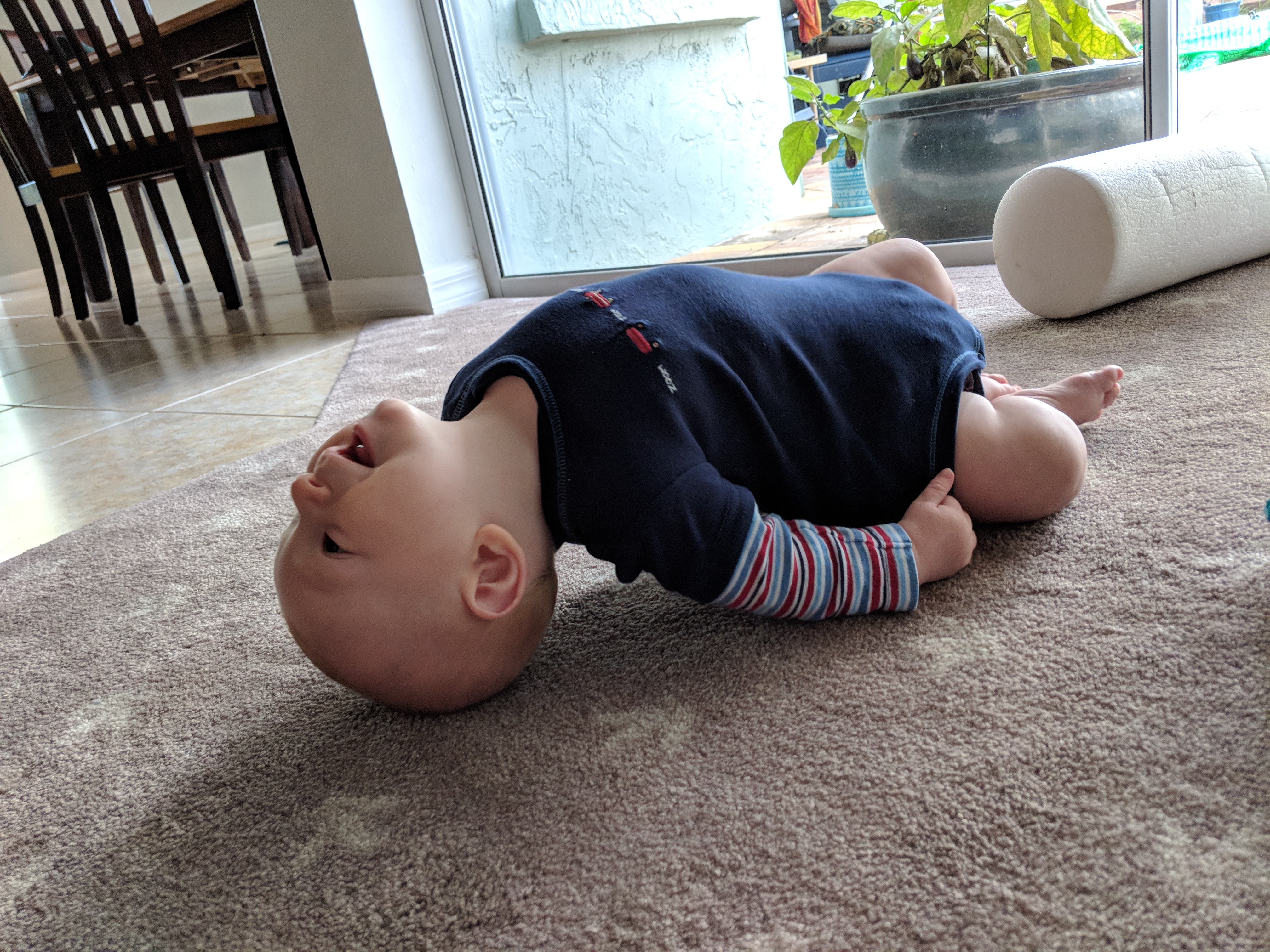 Enzo is new on the planet (born January 16, 2018 at 5:32AM) but he has picked up on certain yogic principles, such as fish pose, quite quickly. Here is his mom, Sarah, describing Enzo’s tendencies.