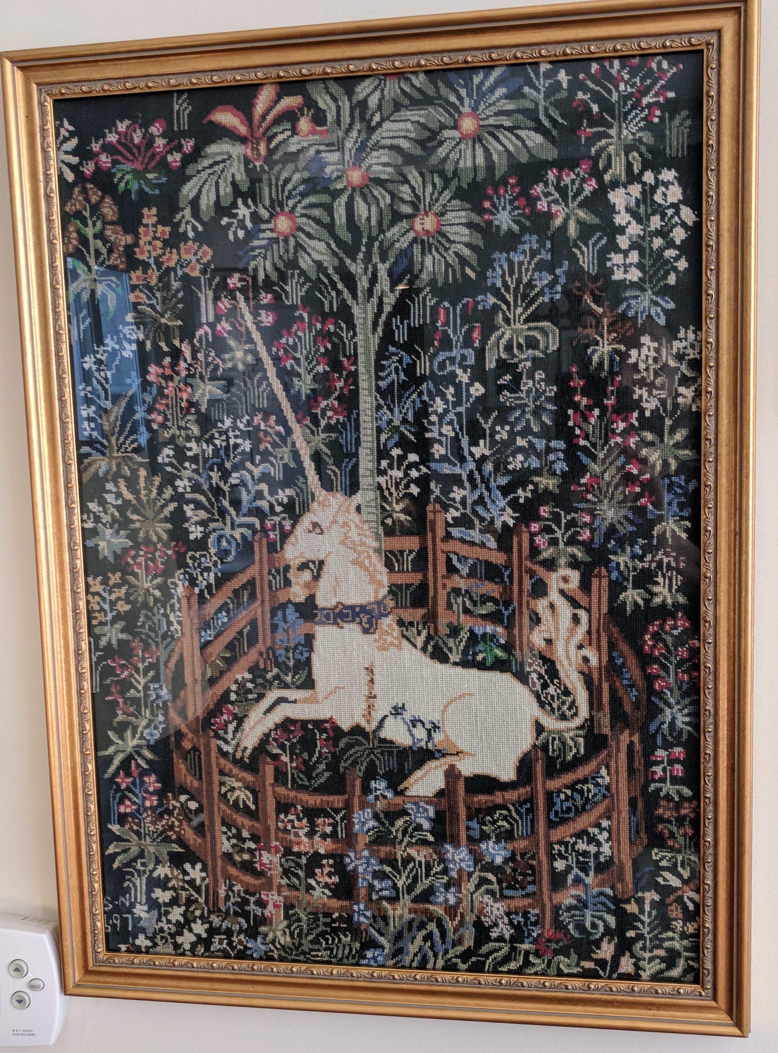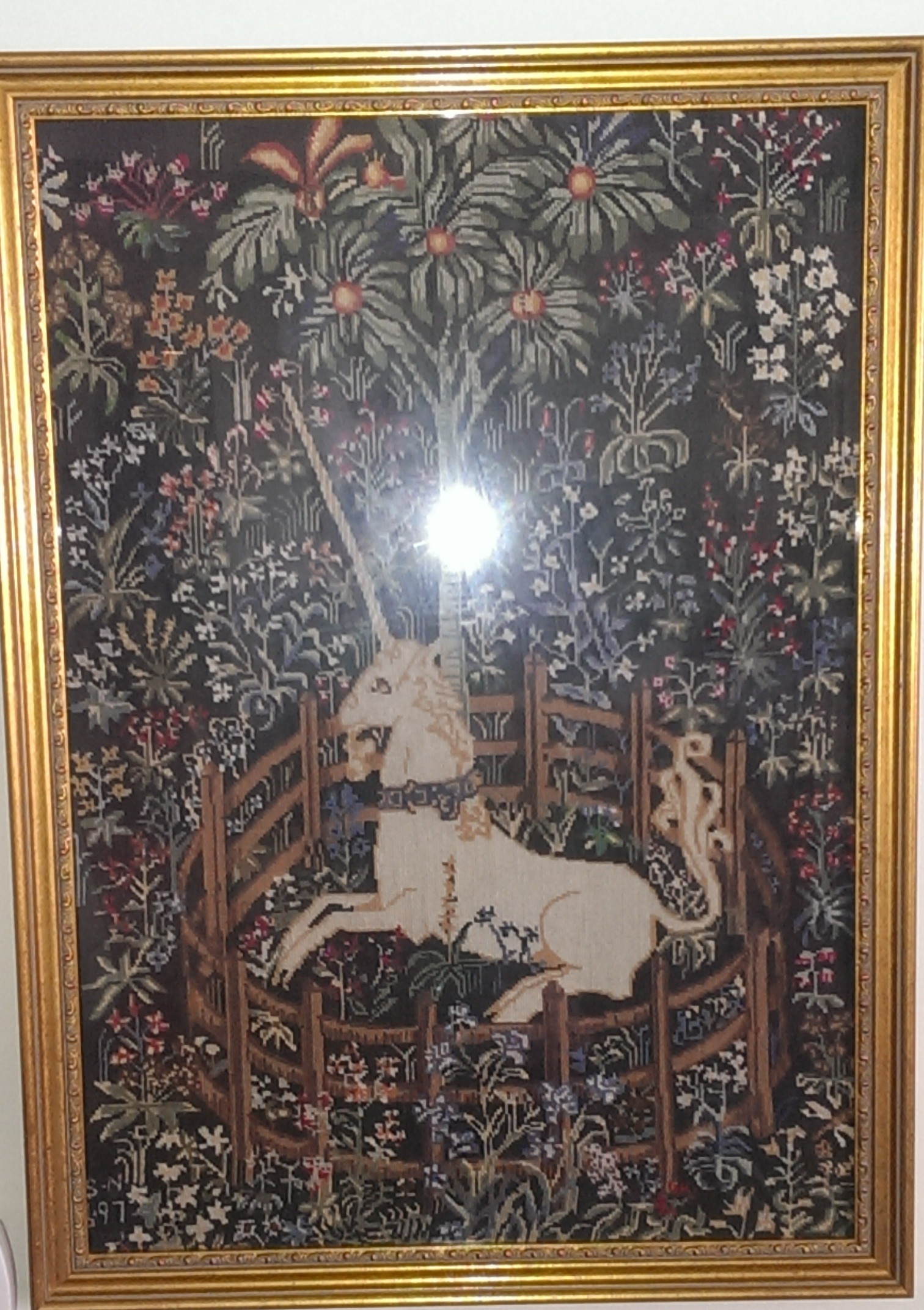 This below piece might well have been one of the top ones he ever did – #7 of the famous Unicorn series titled “The Unicorn in Captivity” – and it was framed in glass – hence the light of my flash in the middle of the photo.