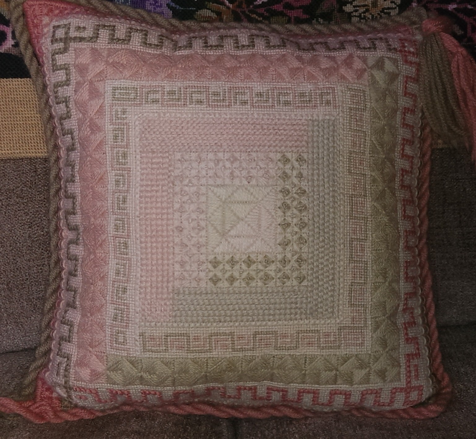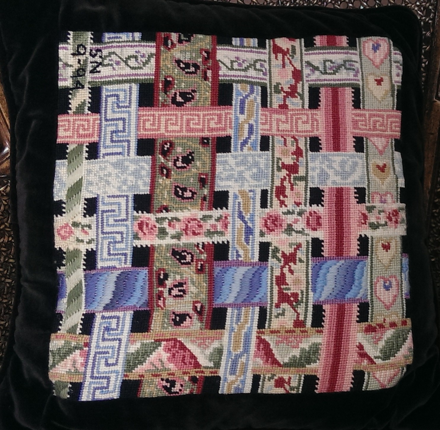 The below pillow shows how many different stitching patterns he would employ on a single project.