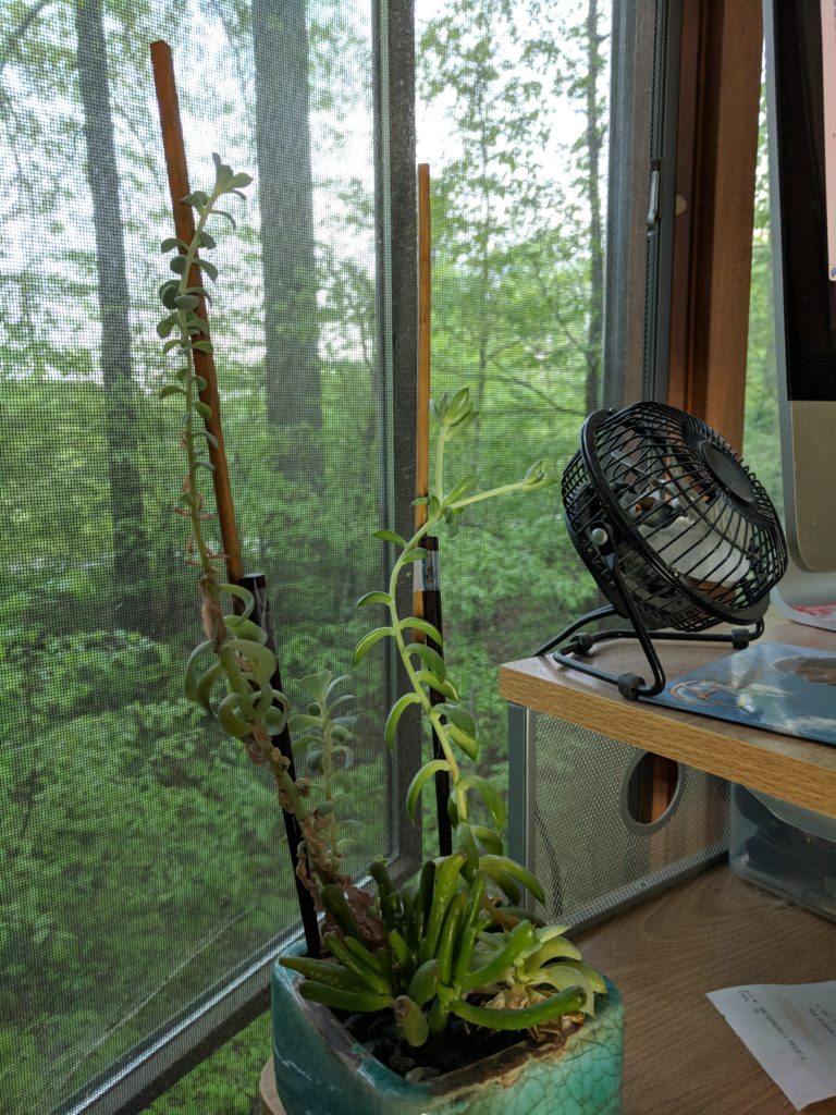 Indoor Plants: These “Succulent Sun Catchers” are definitely on the rise. They need two sets of chopsticks to keep upright. Hence the old traditional saying, “There is nothing in life like a well-placed chopstick!” In contract, their brethren (there are four plants in the pot) remain low lying fellows.