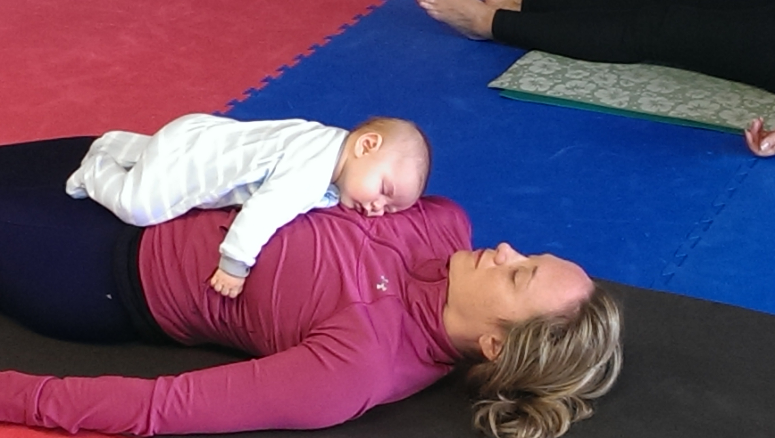 Here we have Mama C and Baby Pearl (11 weeks) practicing the ultimate in shavasana (corpse pose).