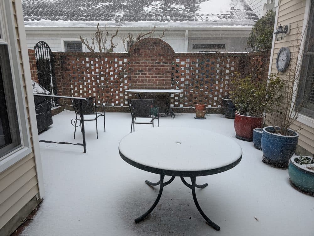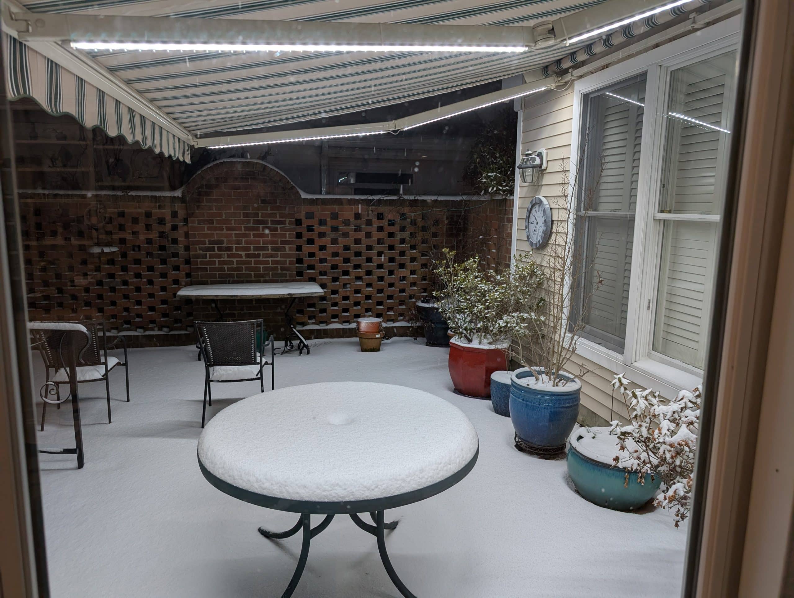 Here is our patio last night at about 10pm under the LED lights of our awning. A bit more snow fell over the nighttime, but not too much more.