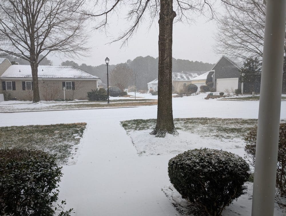 And, yes, a relatively docile snowfall began about 1 – 2 hours ago and it is definitely sticking. Here is an early look at it….at present we have a touch more than what the below two photos show which were taken an hour ago.