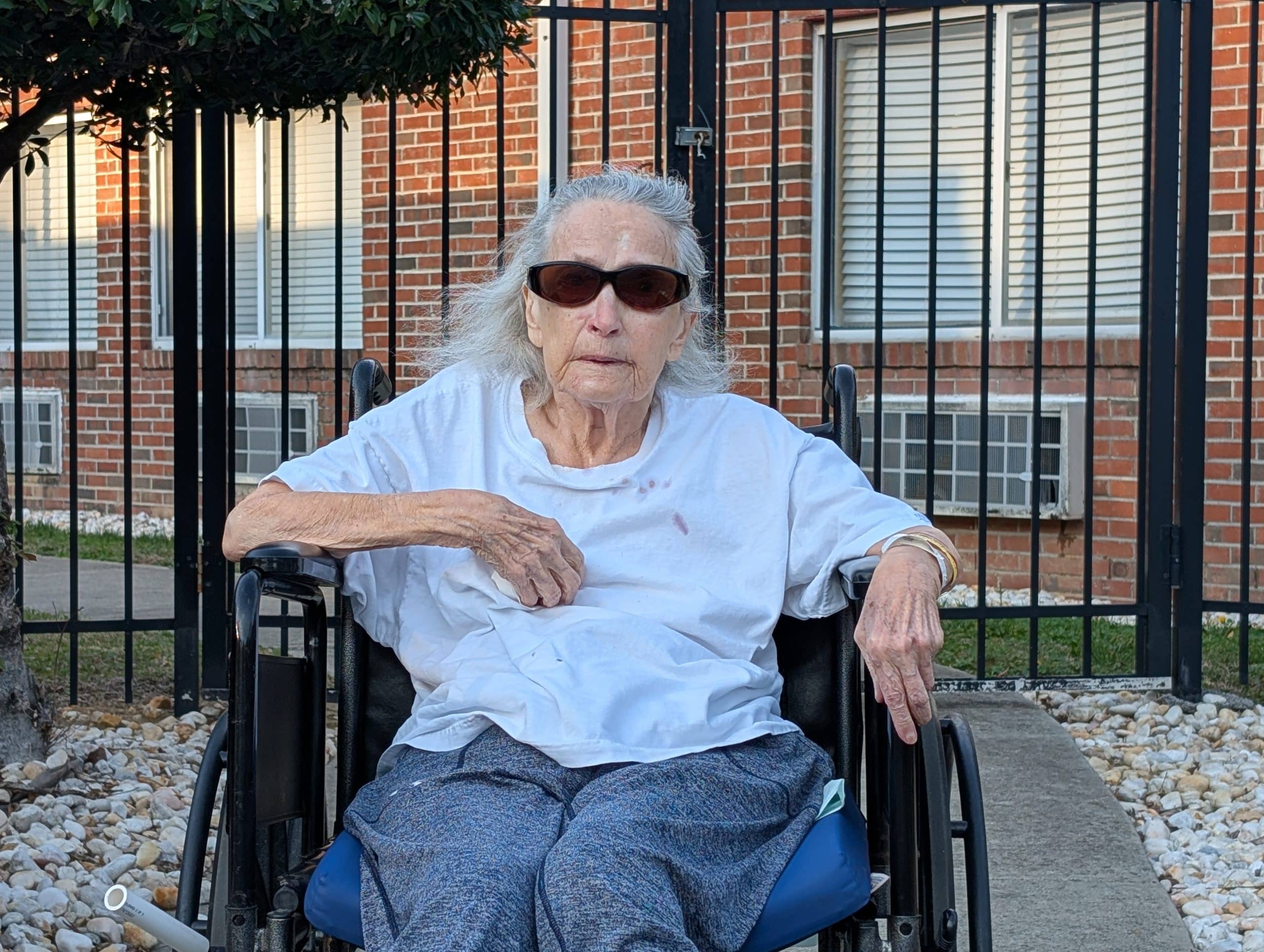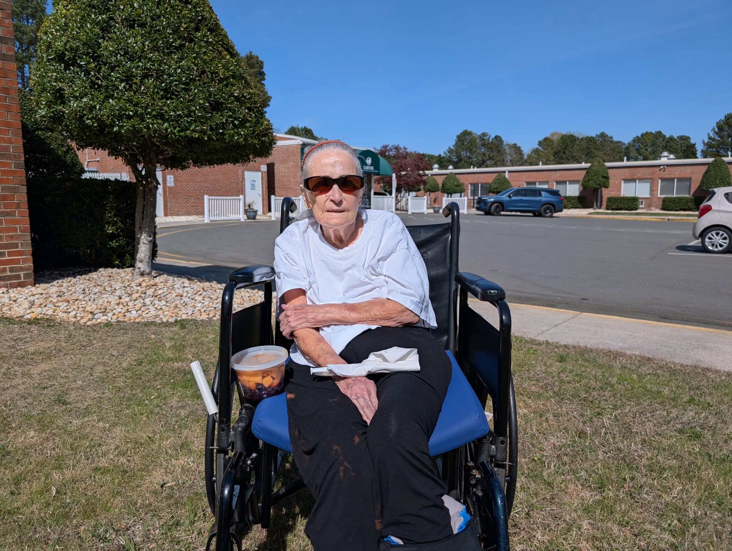 Mom chugged down the thick smoothie (banana, dates, PB, ground flax seed, protein drink, and amino acid supplements) quite nicely. She finished it completely – an entire pint. Then we went outside for that later part of the afternoon. It was in the mid-80s and mom loved it.