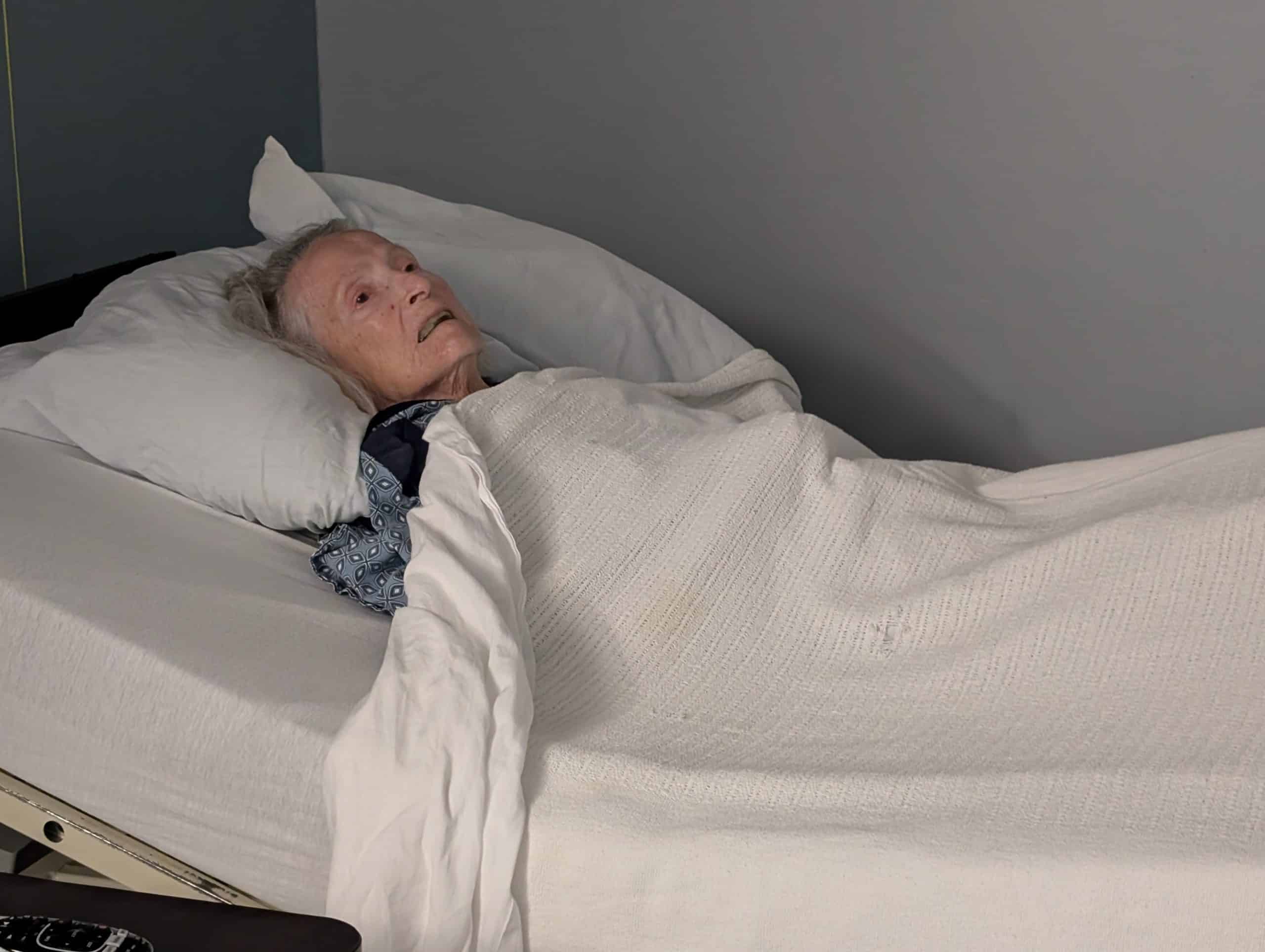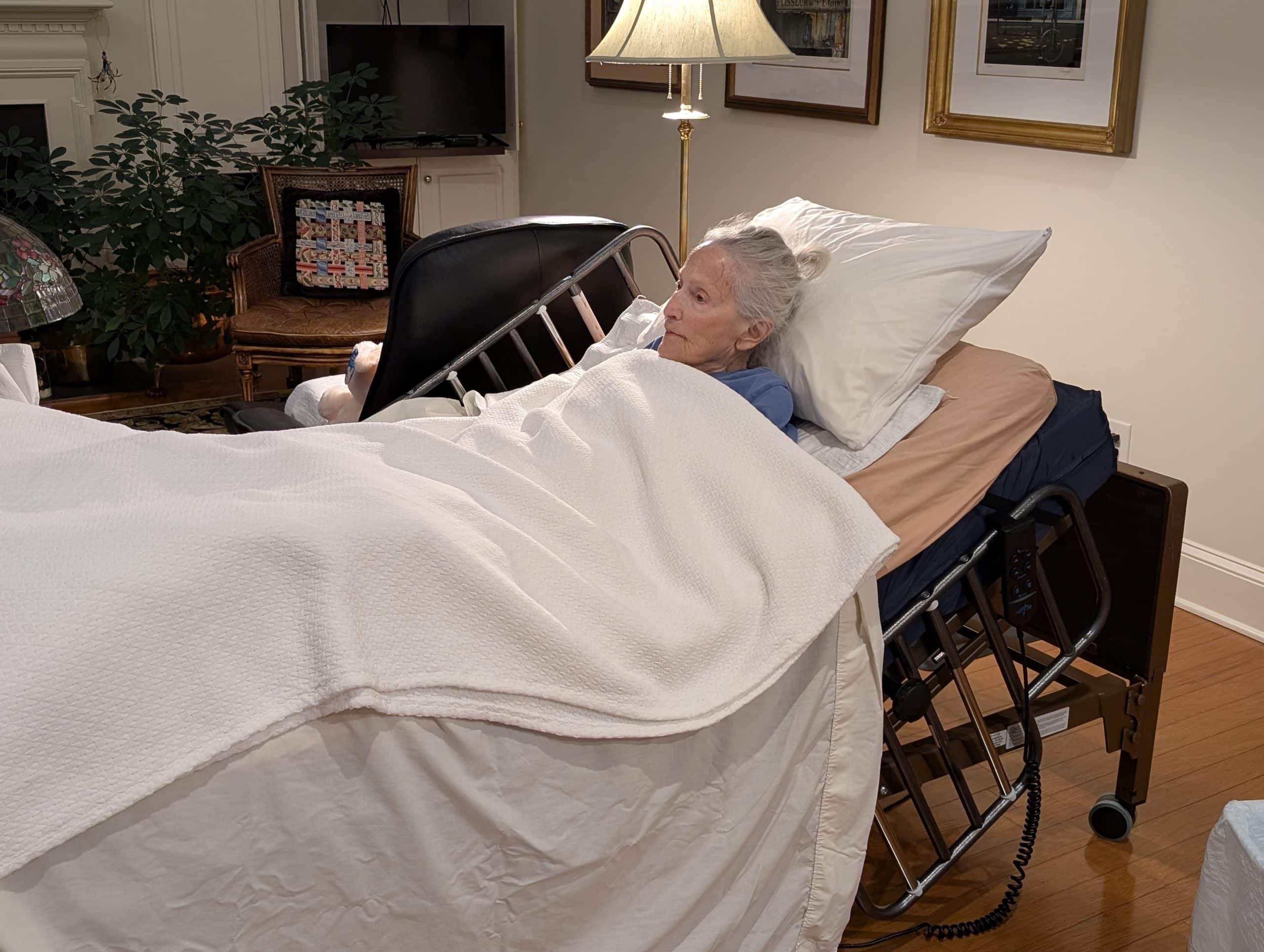 Below: Mom is lying down in her medicare hospital bed which is set-up in the main part of the house.