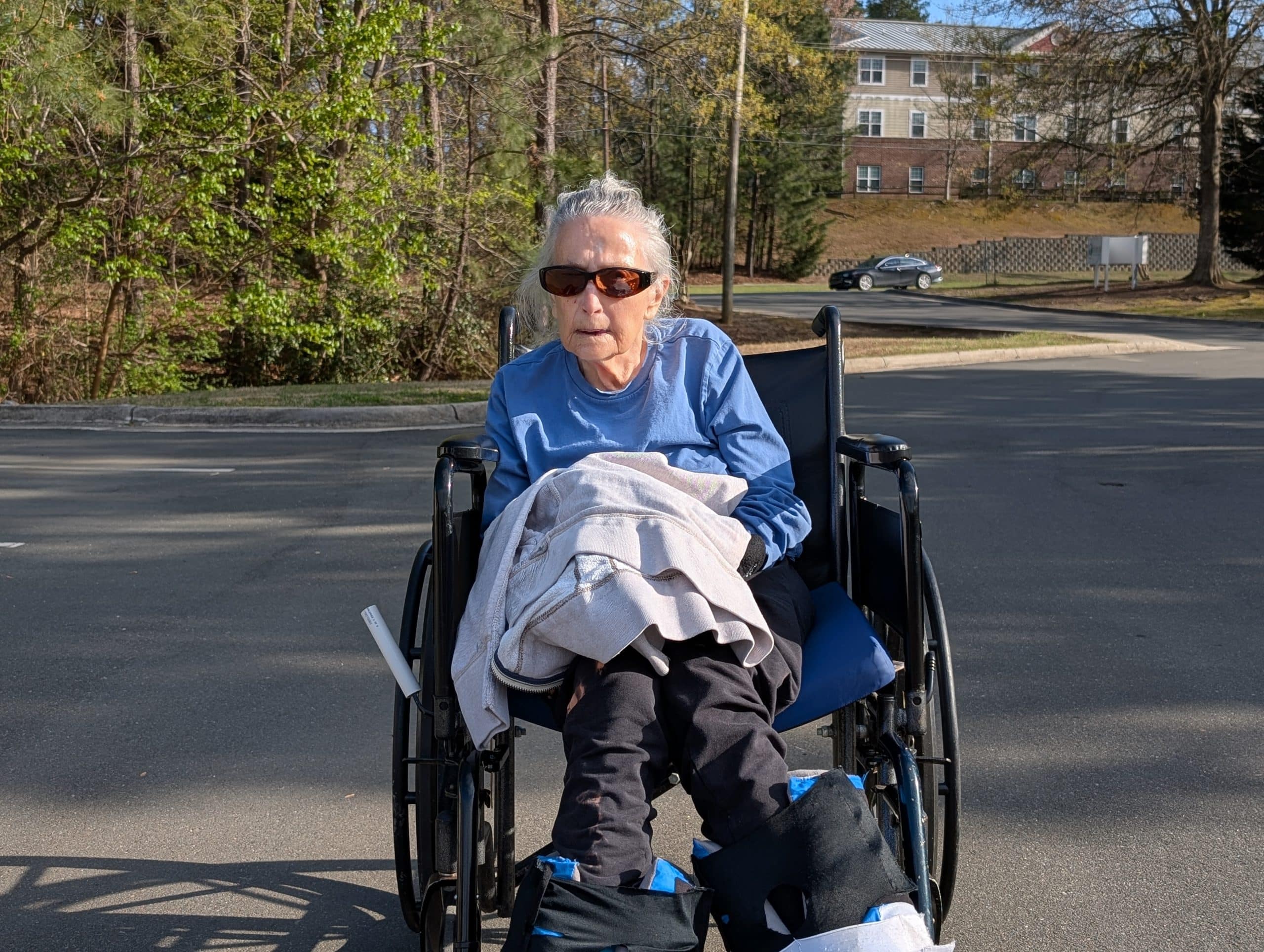 We pulled the car into the garage and got mom in her transport chair. To help orient her and cement the idea in her mind that we were really home, the first thing we did was take a cruise around the block to the front side of the house. That way she could see her neighborhood and get the idea that we were really home. And that was her desire as well – she wanted to go for a walk before going inside the house. We did see one of our neighbors walking his dog and chatted for a bit – and mom remembered their dog Tucker who loves to jump up and sit on mom’s lap.