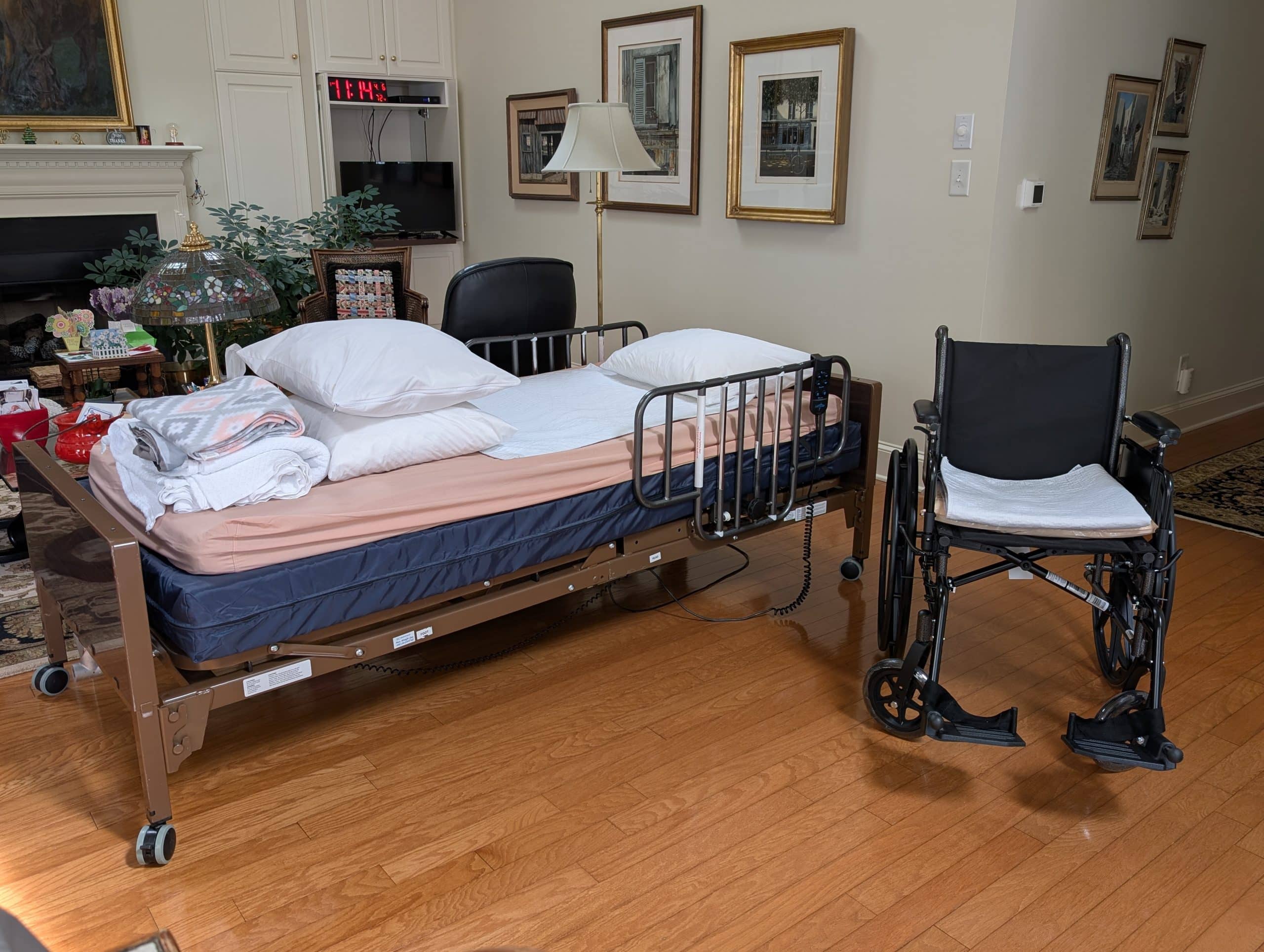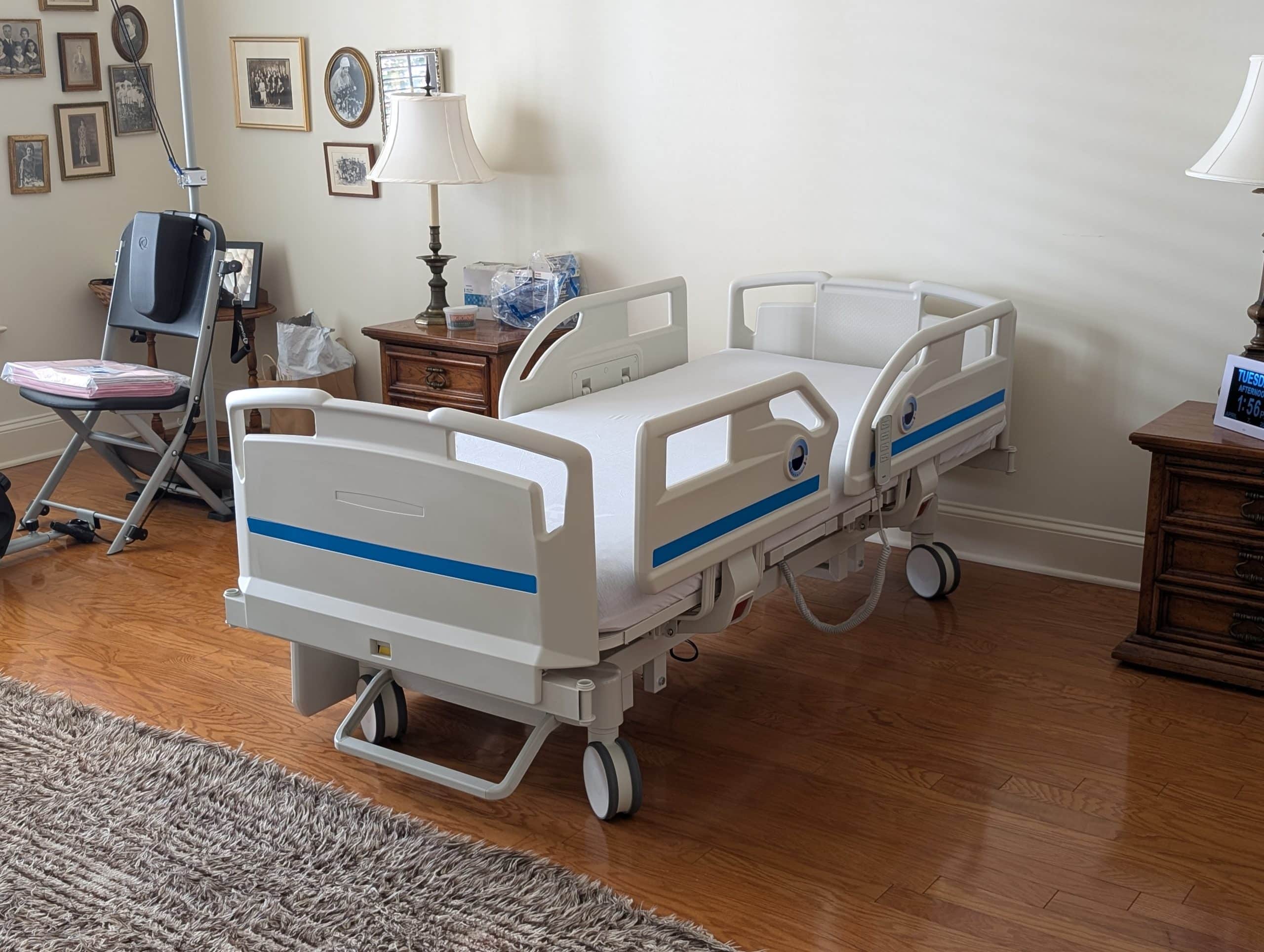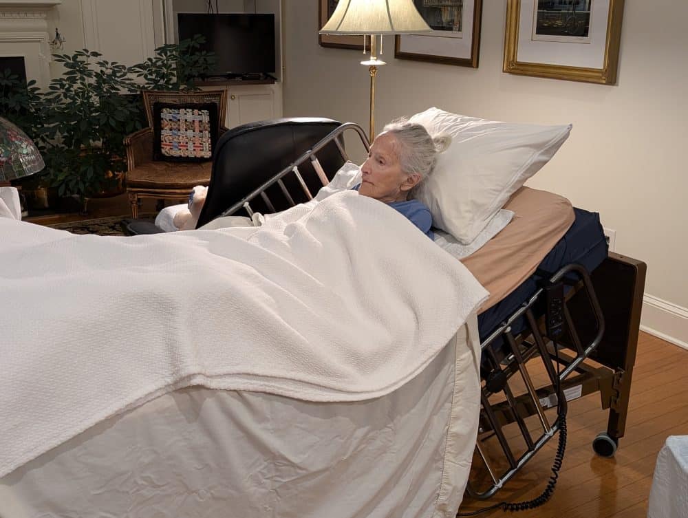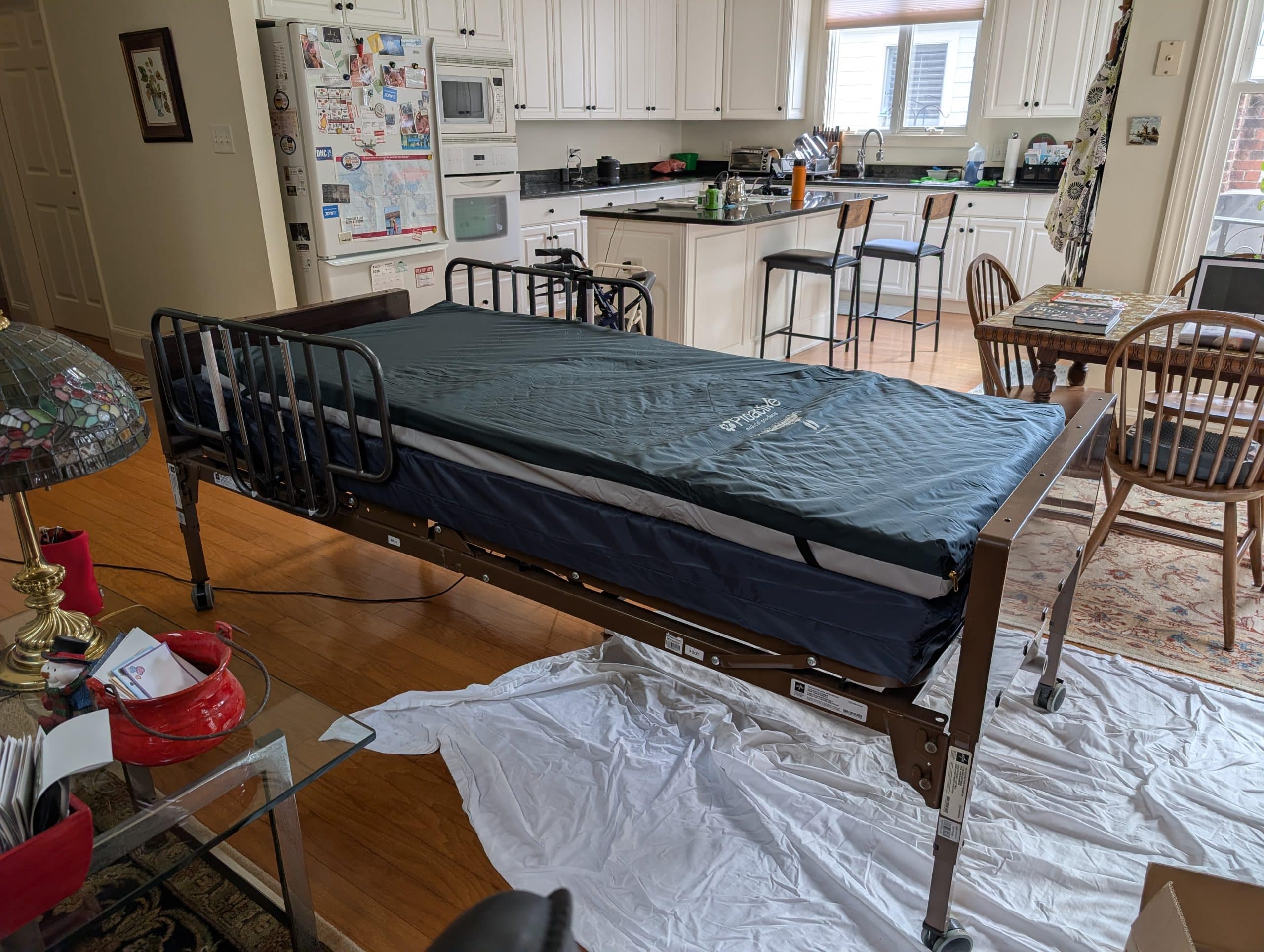 Below: Here is the bed after the initial set-up in mom’s bedroom. This is our second and final(!) medical bed. Mom did not sleep in it tonight, but should start using it tomorrow night.