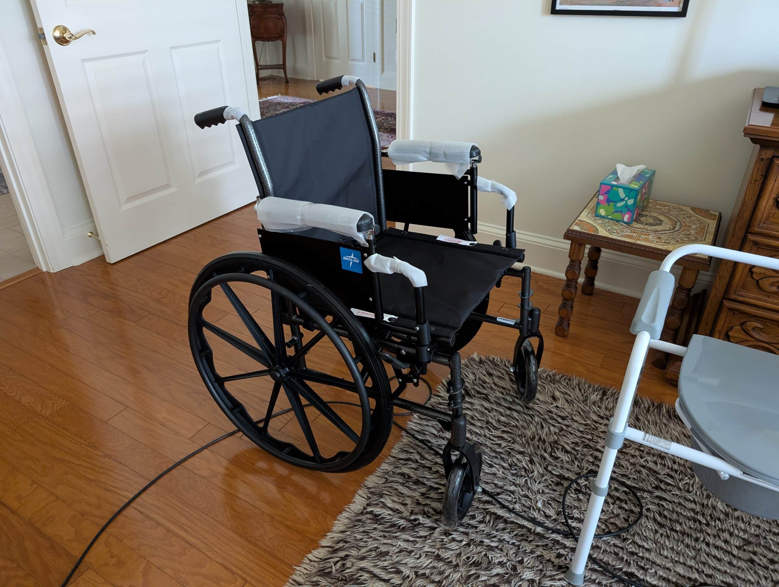 The wheelchair that came is wonderful – very good quality, and it will be our main indoor wheelchair. And the other two pieces that arrived are also good to have around. So, all in all, a fine order, and it sure was a surprise to see the bed rise up automatically. So we now have a bed, with one more on the way.