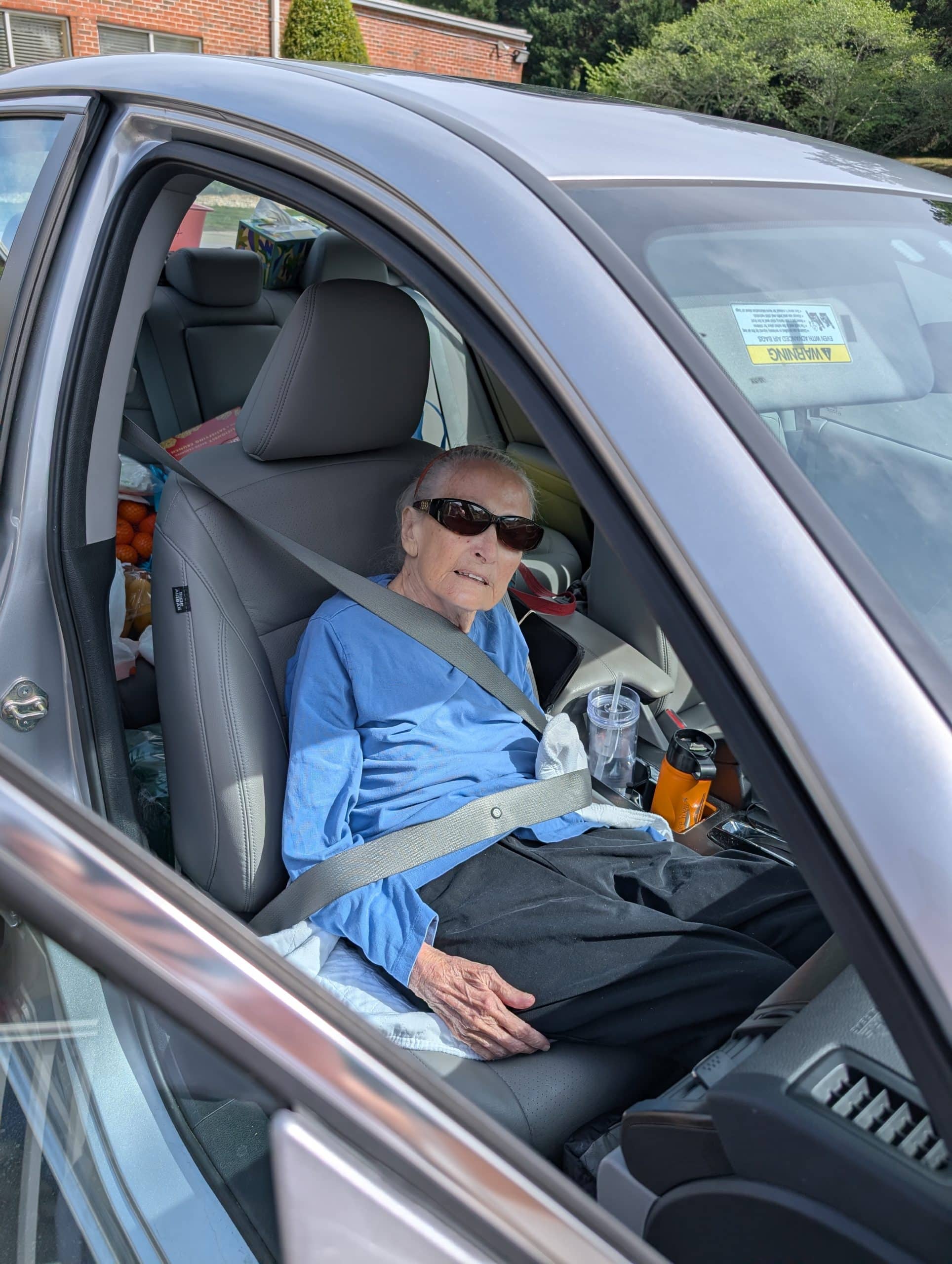 Below: Here is mom getting settled in the car as we are about to leave the rehab center.