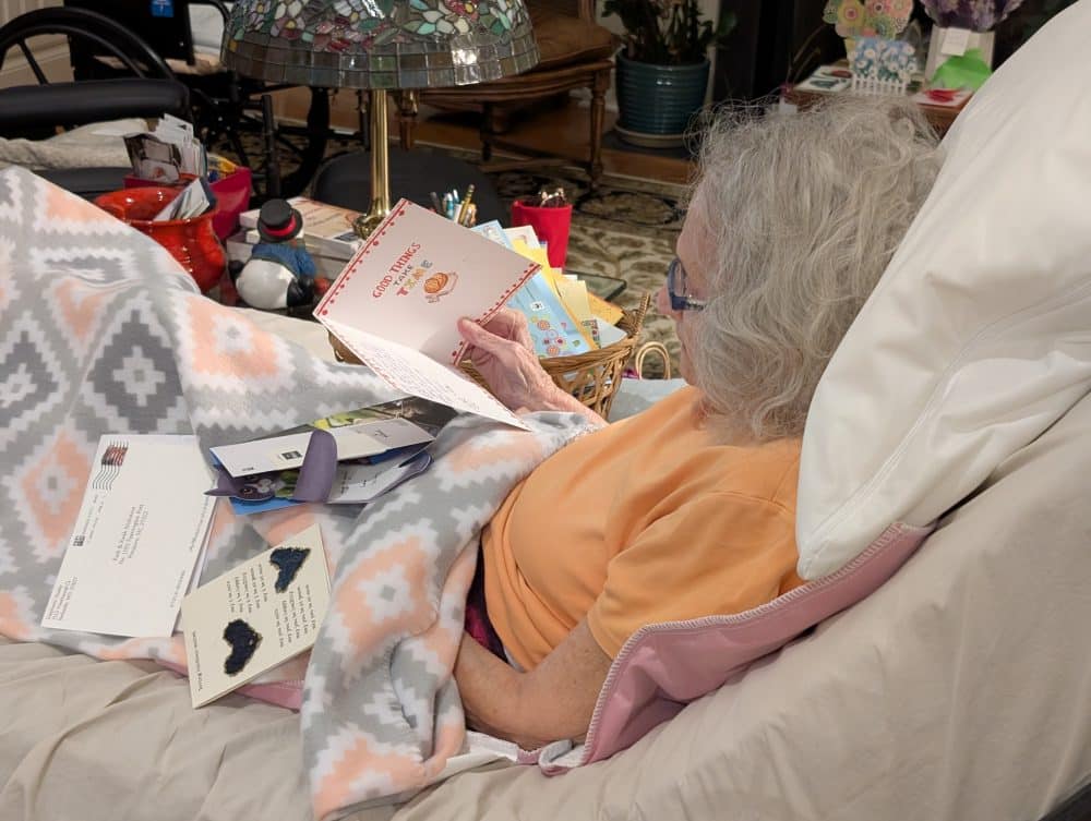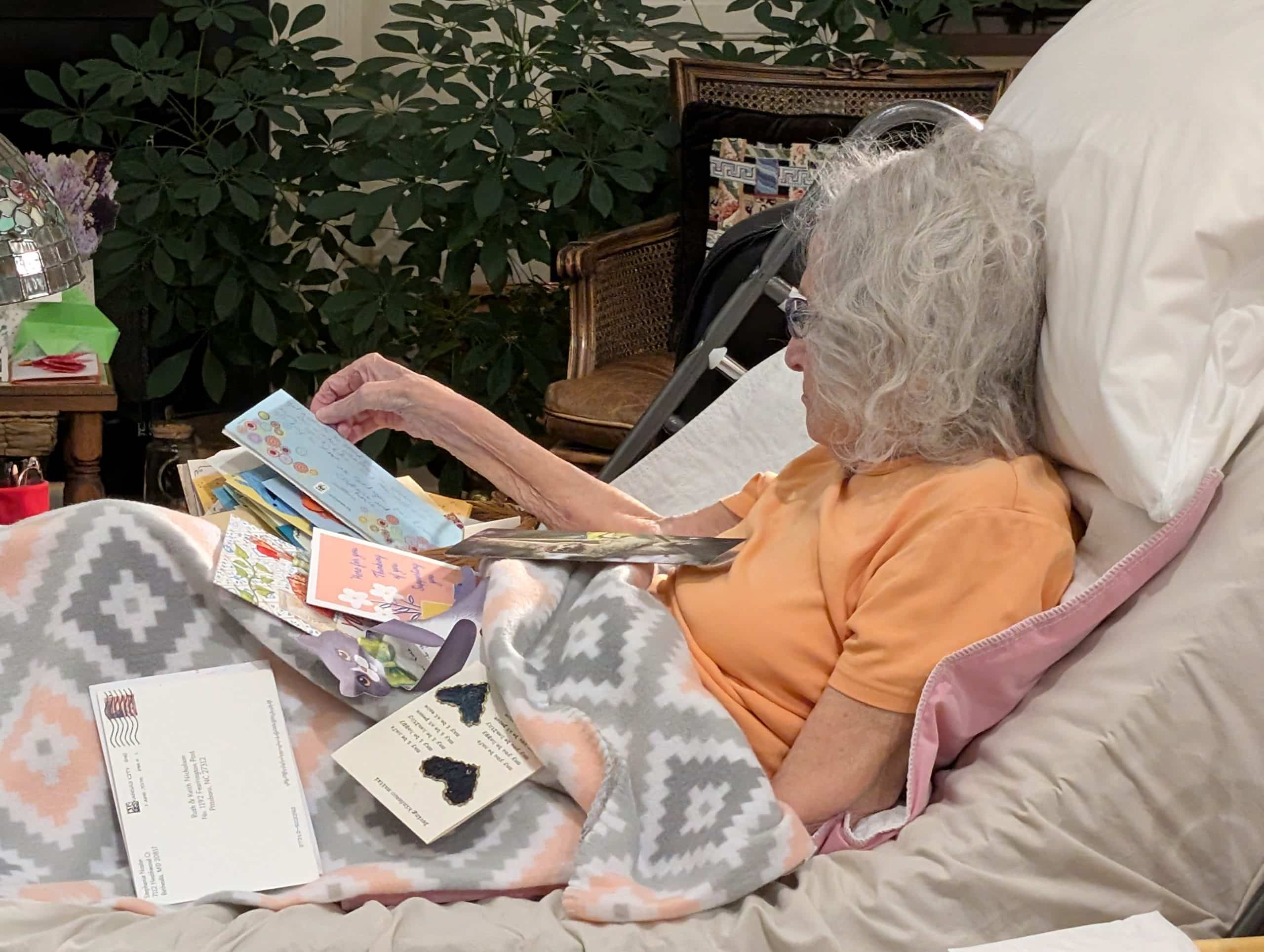 After being comatose for six hours, mom emerged out of it like everything was perfectly normal, as she always does, and she was ready for Friday. She polished off her substantial breakfast smoothie at 7p or so, just in time to digest it before dinner. She ate a solid dinner of rice with a blended mix of broccoli, asparagus, tomatoes, and tofu with ginger, ground hemp seeds, and other spices and toppings. Then she ate a 3-layered bowl of ice cream. She was ready in bed by 11:45p. I just cannot emphasize how helpful it is to have two beds. That way I can have one bed ready for sleeping as I get her out of the other bed that needs attention. To redo that affected bed and get it ready for nighttime sleeping with her in it would be a big job at this late hour for an already overworked caregiver. So that second bed is a real life-saver. Then the other bed can be attended to without her in it. In between her smoothie and dinner, mom took great interest in her absolutely massive collection of cards – pictured below.