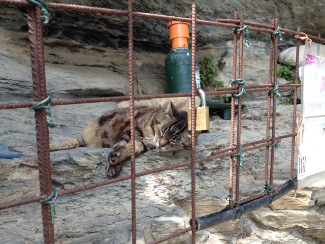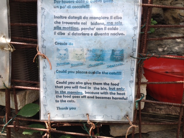 Such a sweet, sweet moment on our hike today (Fri, 5/11): a refuge for feral cats and directions for caring for them up on the mountain path to Monterosso…