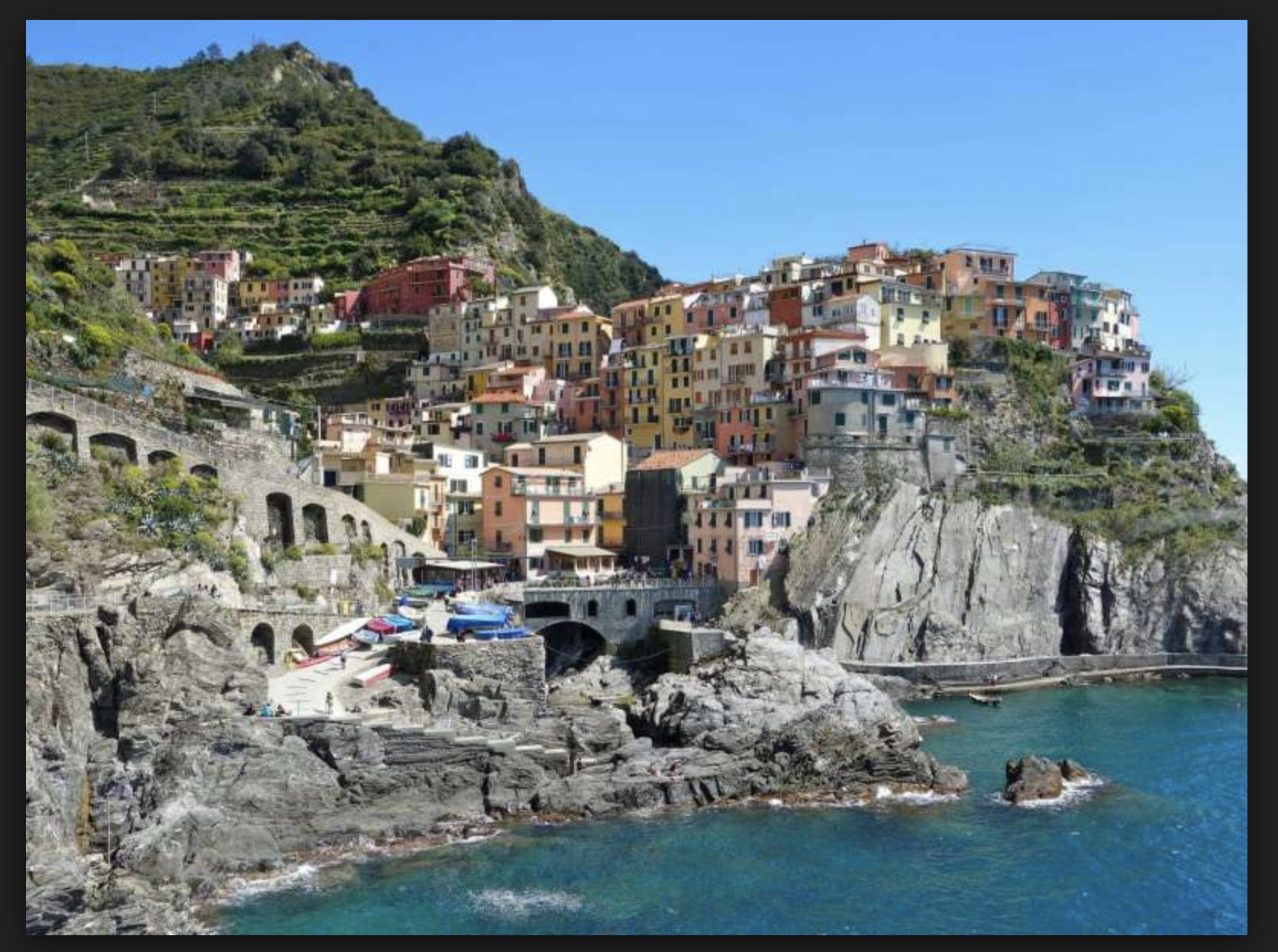 The Cinque Terre (meaning “Five Lands”) is a rugged portion of coast on the Italian Riviera. It is in the Liguria region of Italy, to the west of the city of La Spezia, and comprises five villages: Monterosso al Mare, Vernazza, Corniglia, Manarola, and Riomaggiore. The coastline, the five villages, and the surrounding hillsides are all part of the Cinque Terre National Park and is a UNESCO World Heritage Site. Over the centuries, people have carefully built terraces on the rugged, steep landscape right up to the cliffs that overlook the sea. Part of its charm is the lack of visible corporate development. Paths, trains and boats connect the villages, and cars cannot reach them from the outside. (Courtesy of Wikipedia)