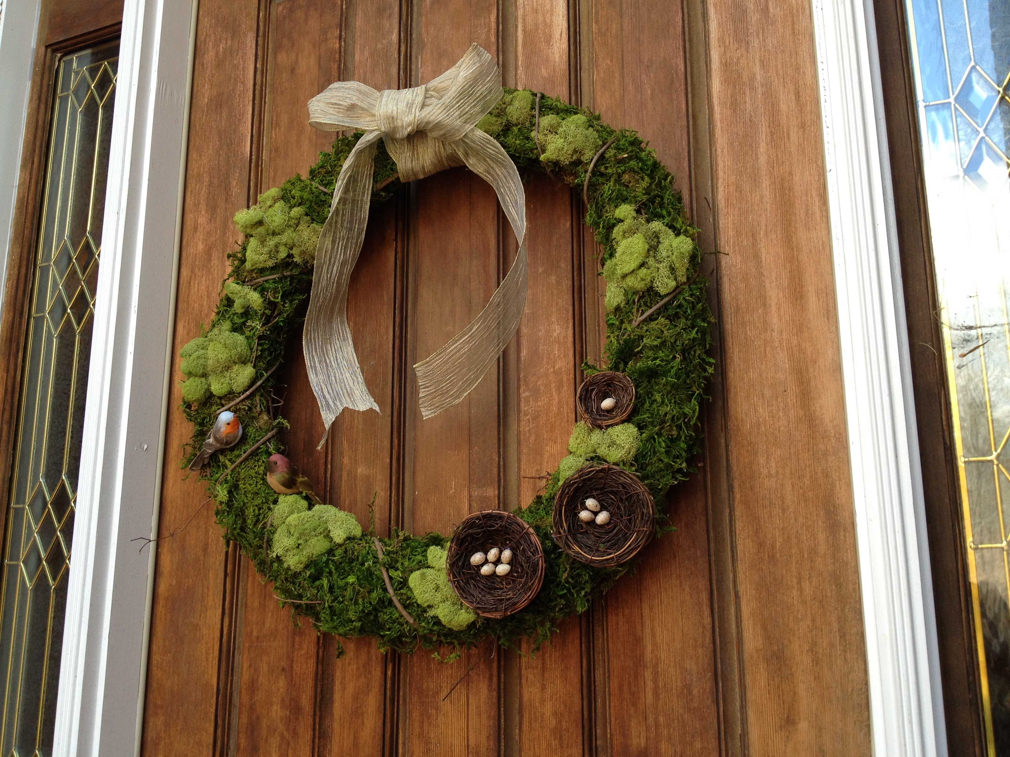 Nancy tells us: I made the wreath because I couldn’t find one that I liked to purchase. There are so many great ideas online and I combined elements of several, such as the grapevine wreath, moss, birds and nests. It was fun to make but I have a lot of burns from the hot glue gun.