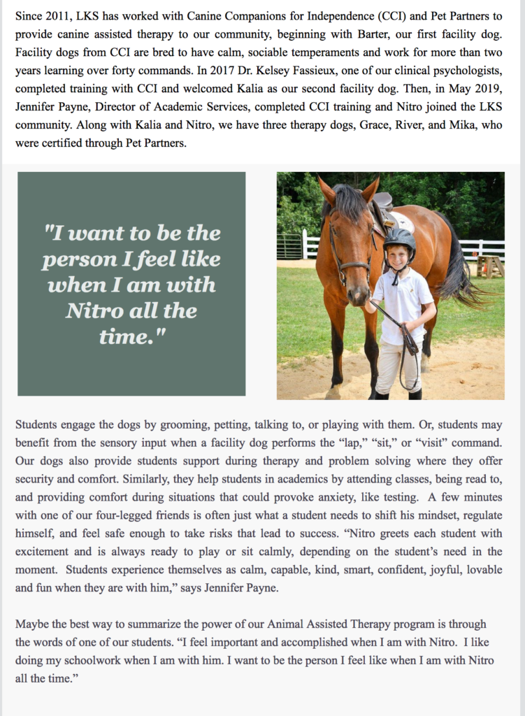Nitro lives with a great family of five, and the mom is the Director of Academic services at the below school where Nitro works. So each and every day, Nitro puts his vest on, gets in the car, and commutes to work with mom.
