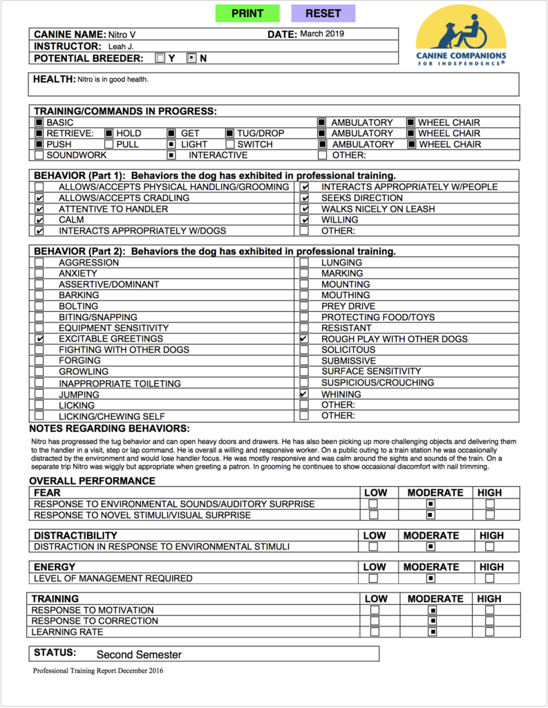 Nitro has progressed the tug behavior and can open heavy doors and drawers. He has also been picking up more challenging objects and delivering them to the handler in a visit, step, or lap command. He is overall a willing and responsible worker. On a public outing to a train station he was occasionally distracted by the environment and would lose handler focus. He was mostly responsive and was calm around the sights and sounds of the train. On a separate trip nitro was wiggly but appropriate when greeting a patron. In grooming, he continues to show occasional discomfort with nail trimming.