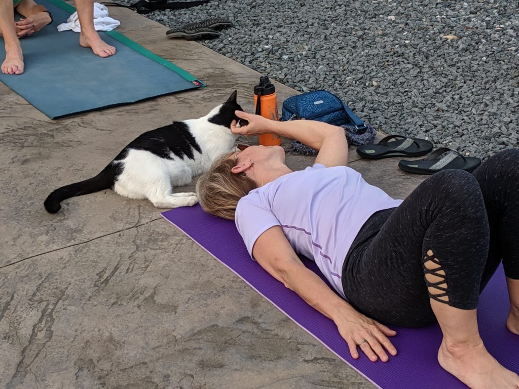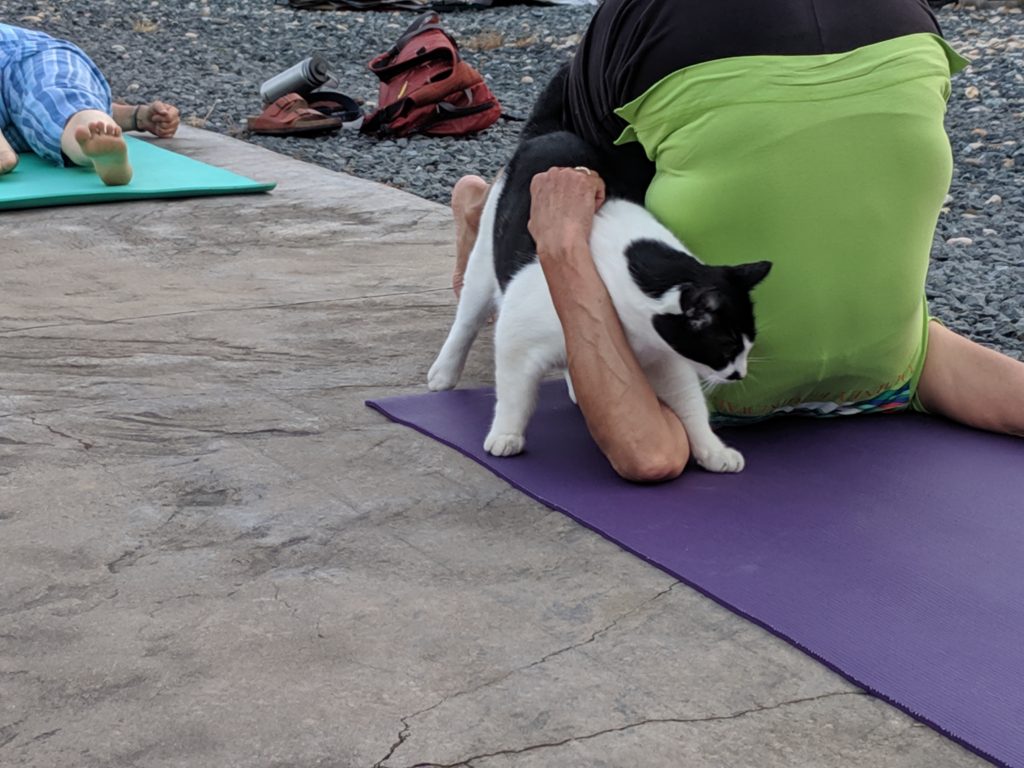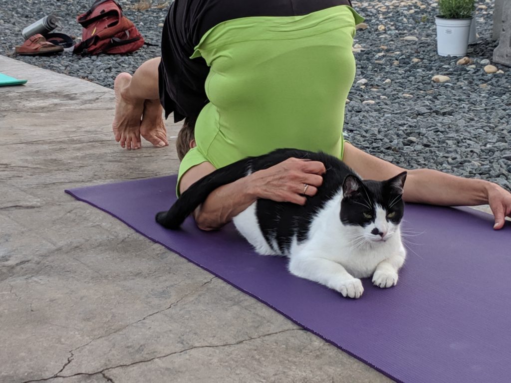 This is Patches – and my goodness, does he love people, and yoga, and yoga mats. He was even trying to squeeze himself into the open end of a tightly rolled up yoga mat.