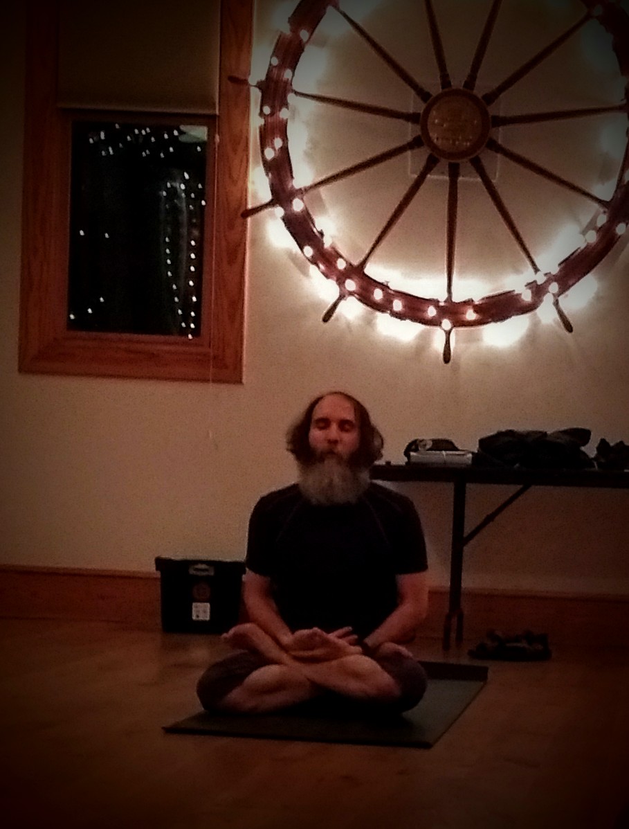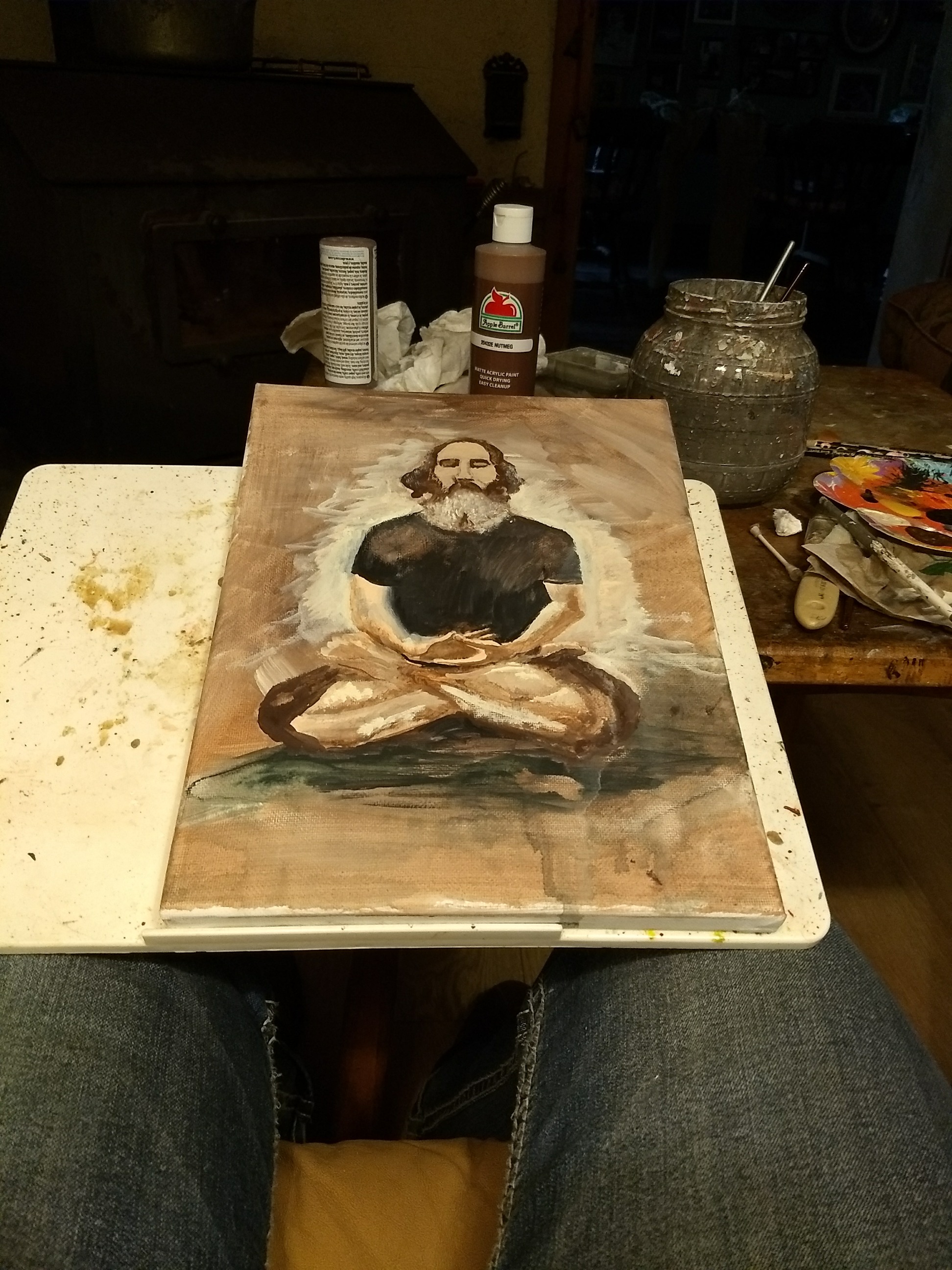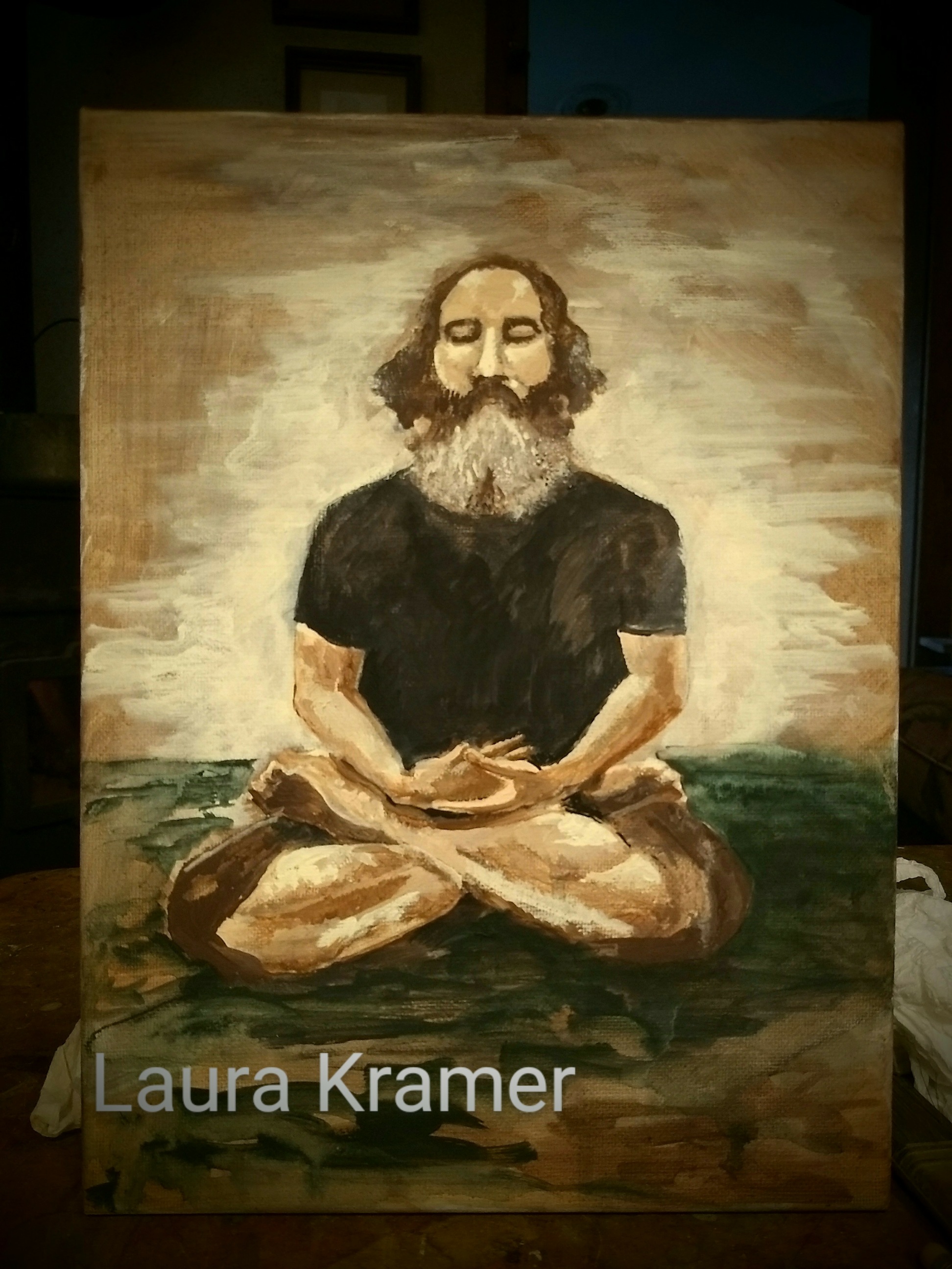 Laura came to class – remember when we still had yoga classes(!!) – on March 4th, less then four weeks ago, with an idea. She said she wanted to take a photo of me during class and asked if that would that be ok. She said she particularly liked the lighting behind me as I sat on my mat, and that she wanted to use the photo as “source material”. Fully aware that I am no one’s prized subject for any photo, I willingly agreed, as in today’s climate of cell phones we’ve all become quite adjusted to being in photos, just as matter of course. Besides, I had no idea what “source material” was, and class was to start in a few minutes.