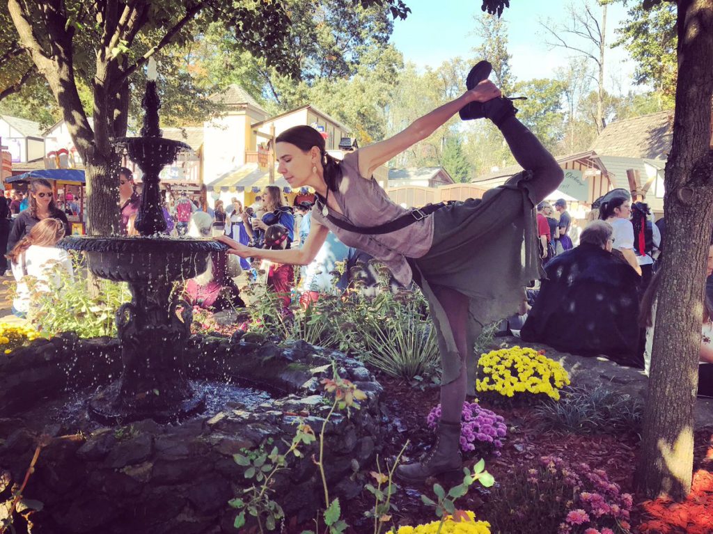 Here is Tree – one of our cherished yoginis – doing an impeccable, statue-like dancer pose in full garb at the Renaissance Festival….