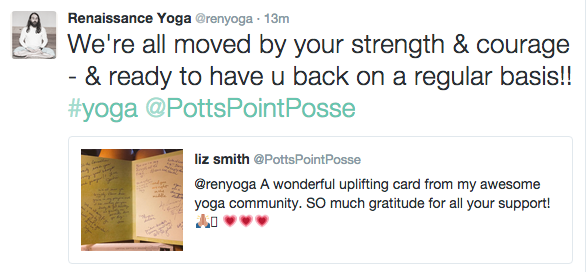 A card went around the Friday class for Liz and as you can see she got it and promptly posted it out on Twitter…and certainly that card is but a microcosm of what our greater yoga community feels…