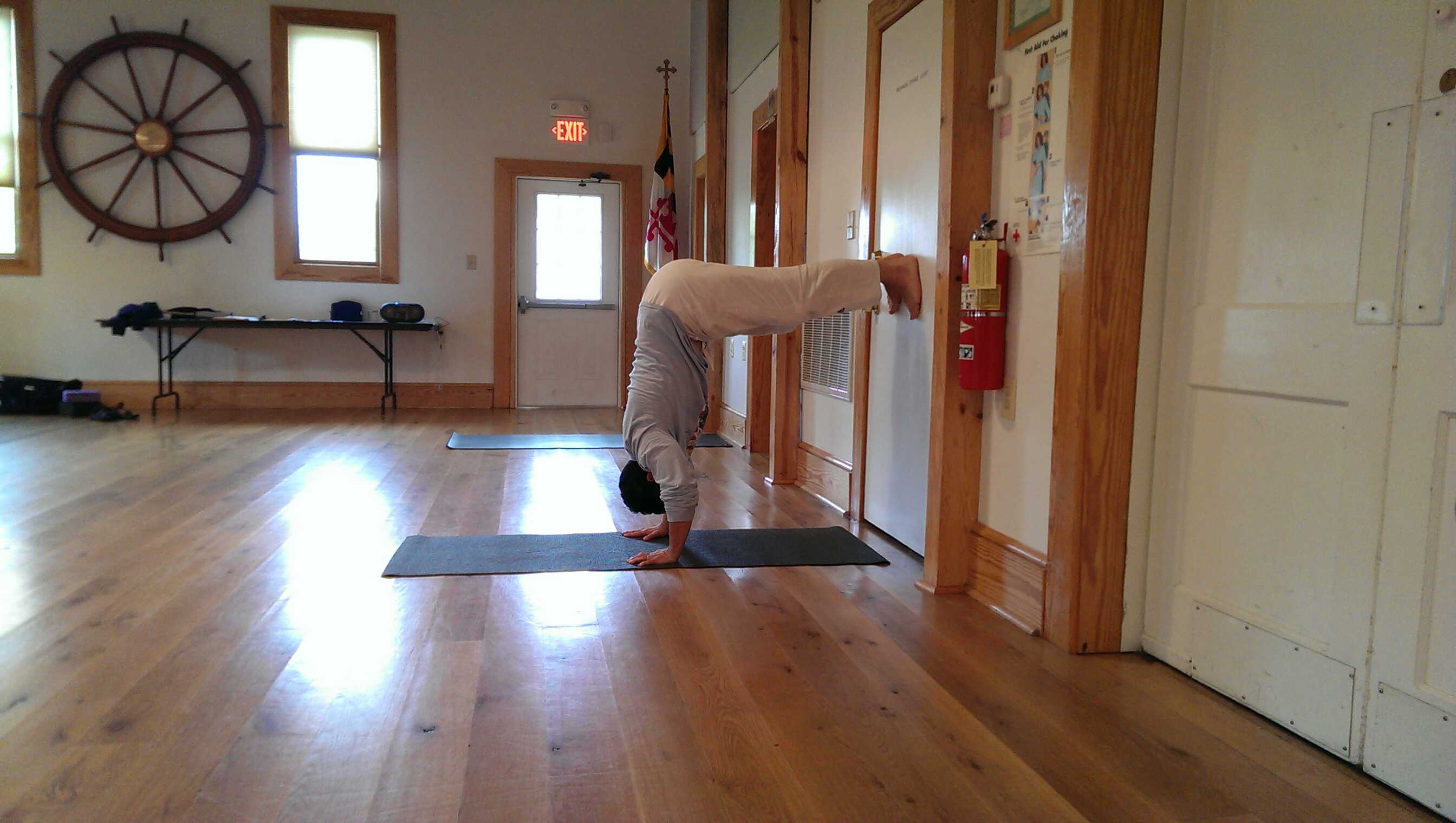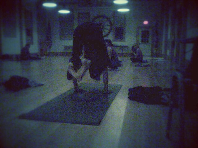 In a dark hall, in a land far, far away, one rogue practitioner was attending to her crow pose when an even more rogue photographer snapped the picture. (More seriously, check out the height of that tail bone in this crow pose – good work!!)