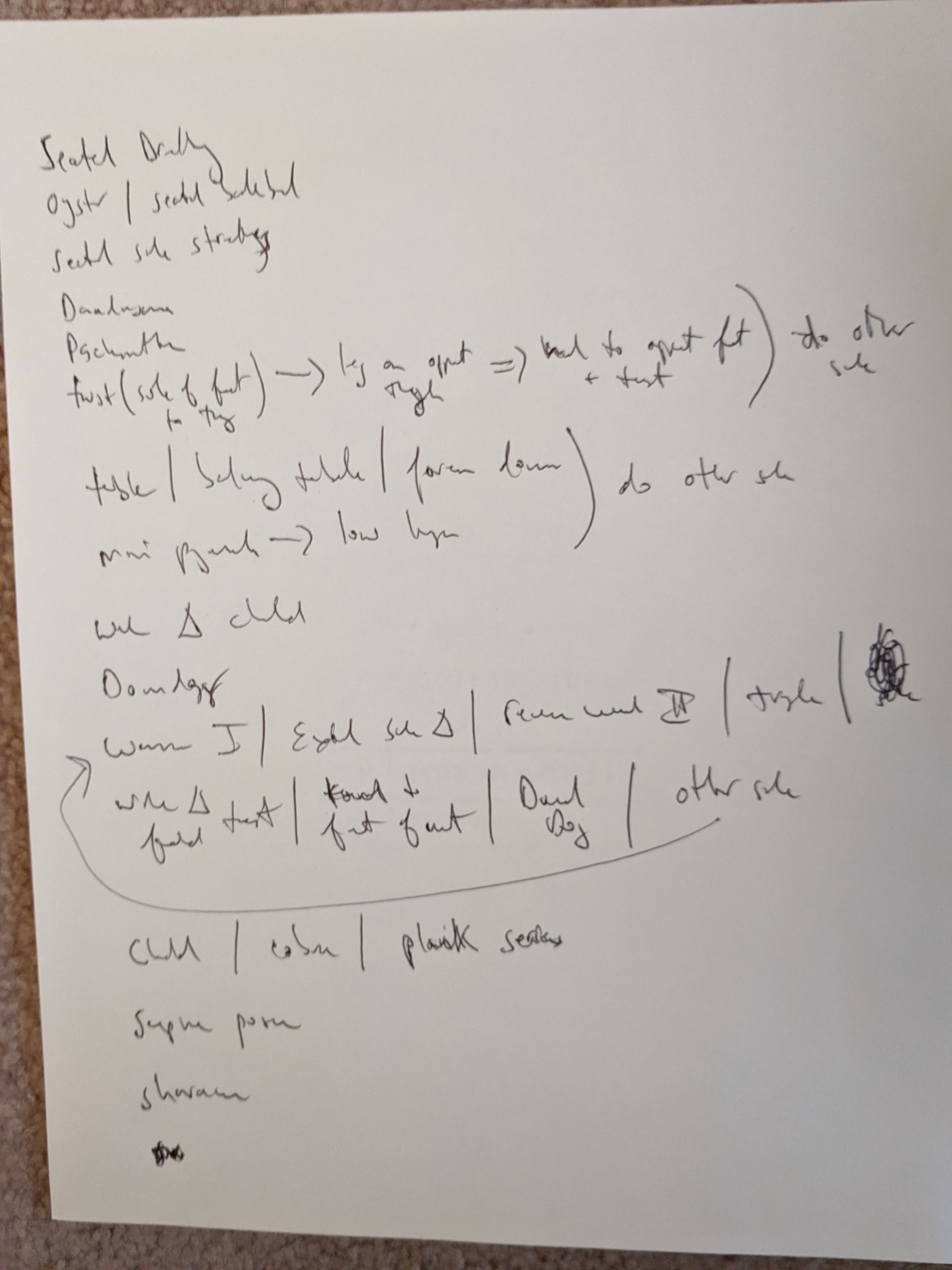 seated breathing / oyster / seated backbend / seated side bend / dandhasana (staff pose) / seated forward fold / seated twist / glut stretch / IT band stretch / table / balancing table / hand to foot / forearm side stand / mini pyramid / low lunge / wide angle child / downward dog / warrior 1 / extended side angle / reverse warrior 2 / triangle / revolved wide angle fold / downdog / plank / dolphin plank / sphinx / makarasana (quad stretch) / cobra pose / child / supine rolls / bound bridge / utksepa mudra / personal time / shavasana / meditation