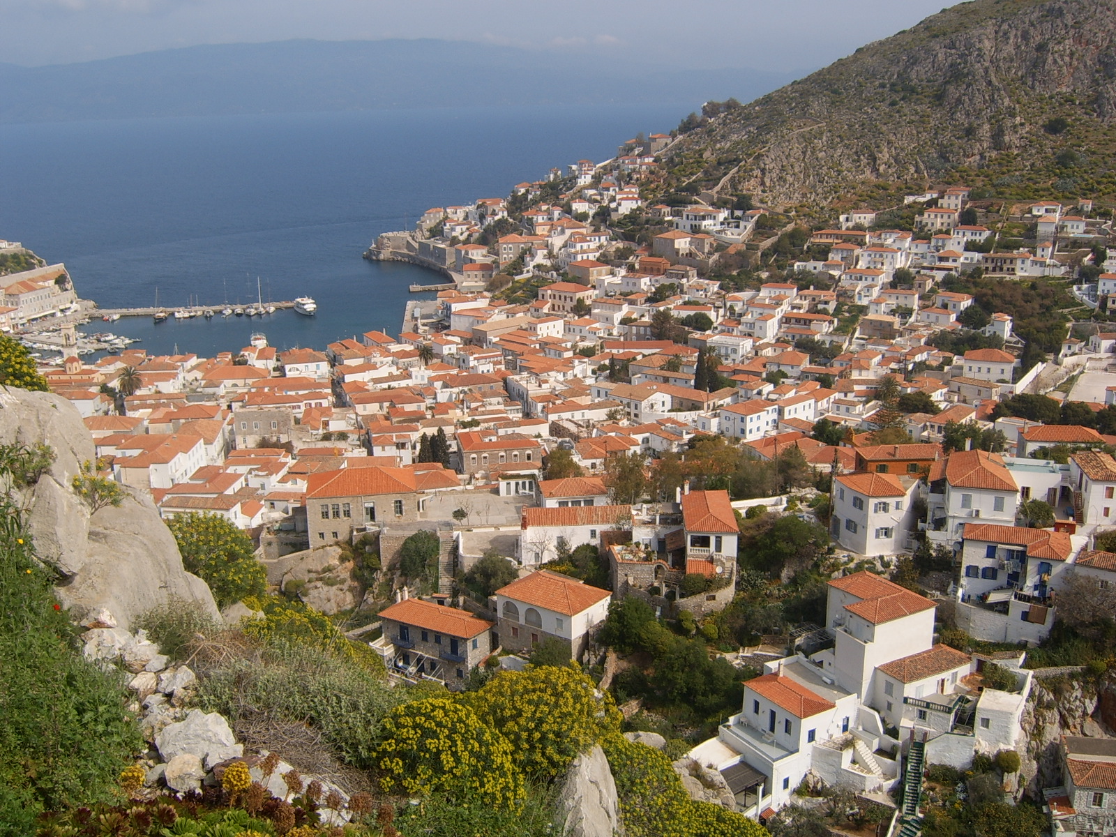 There is one main town, known simply as “Hydra port” (pop. 1,900 in 2011). It consists of a crescent-shaped harbour, around which is centered a strand of restaurants, shops, markets, and galleries that cater to tourists and locals (Hydriots). Steep stone streets lead up and outwards from the harbor area. Most of the local residences, as well as the hostelries on the island are located on these streets. Other small villages or hamlets on the island include Mandraki (pop. 11), Kamini, Vlychos (19), Palamidas, Episkopi, and Molos.