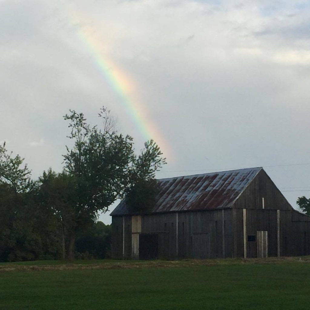 The above is a classic shot of our locale: An old barn, a field, a few trees, open sky, with the addition of a rainbow.
