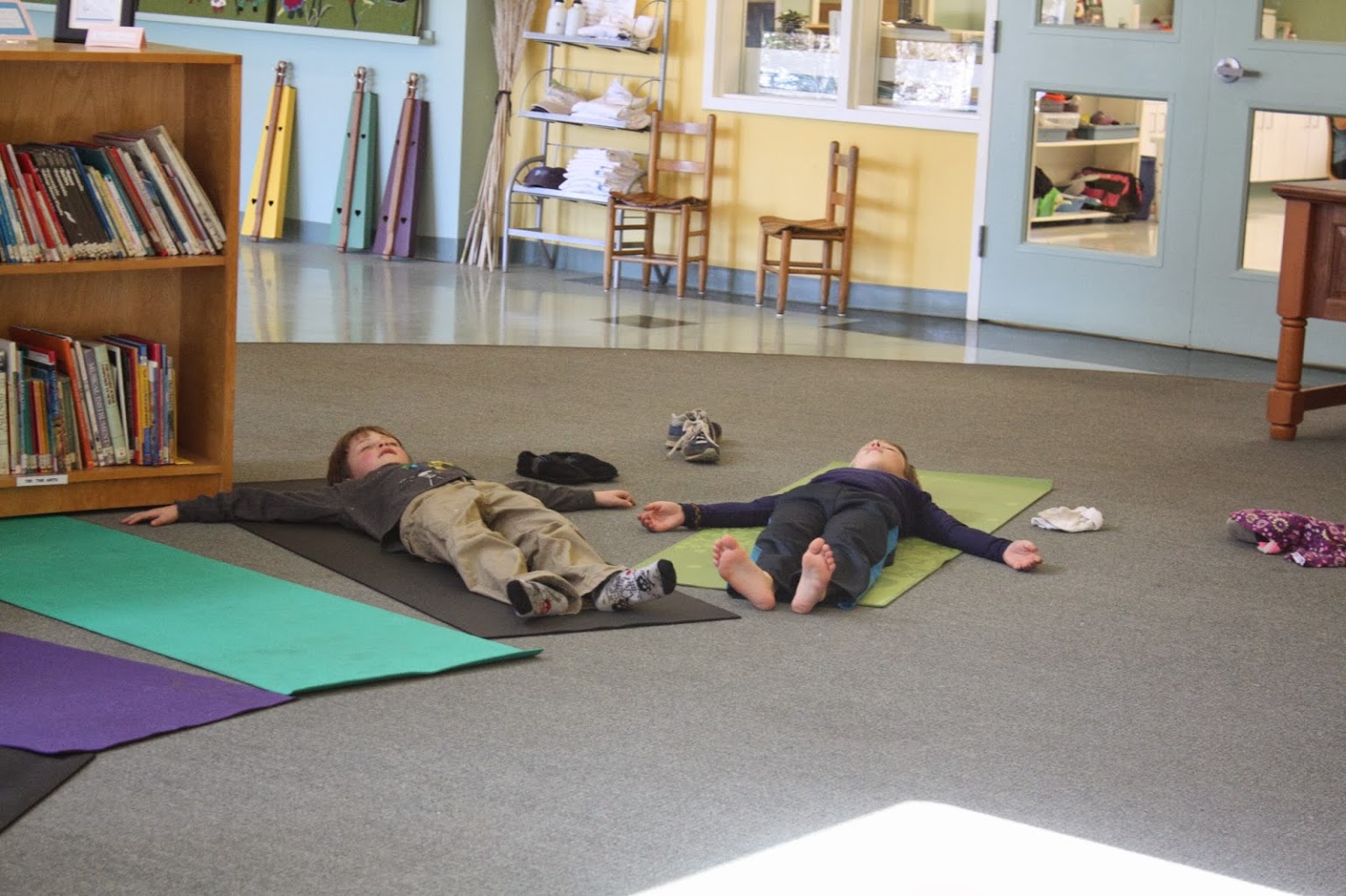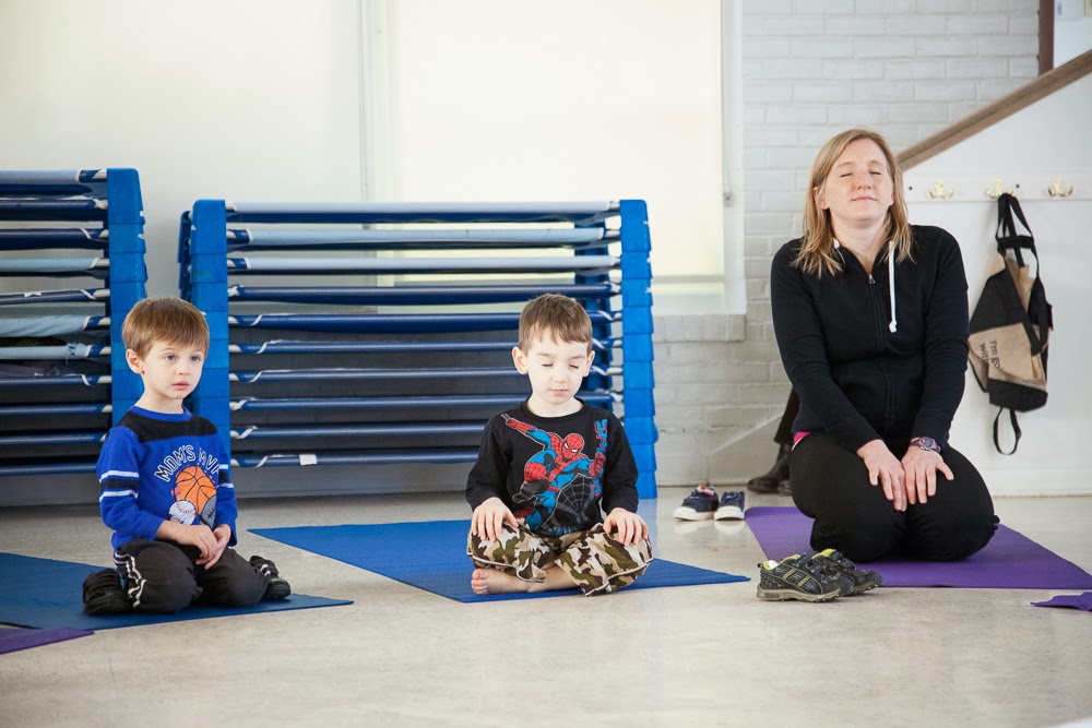 Below is yoga mom – Sarah – taking some meditation time with her son Evan (eyes closed) and another youngster.