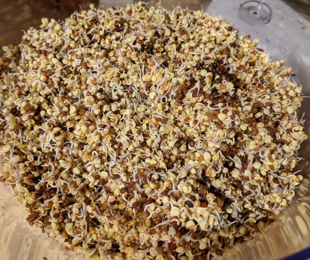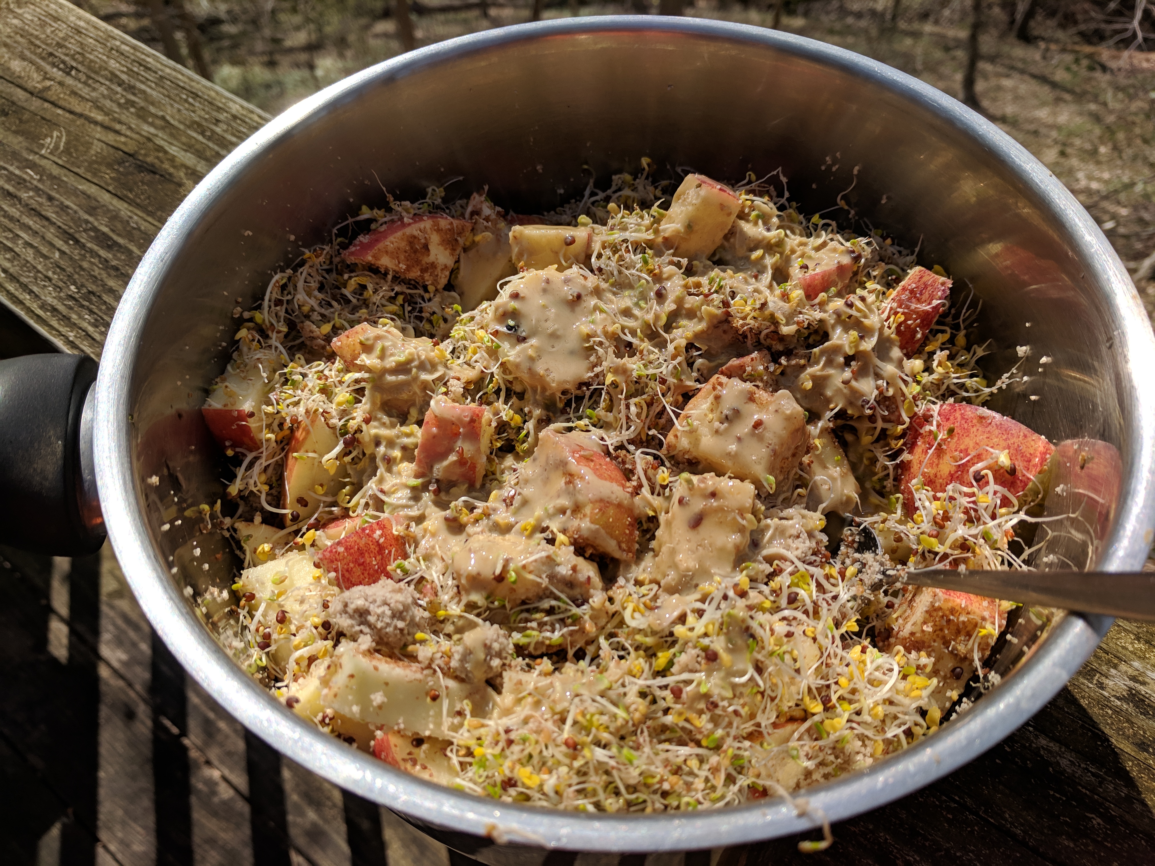 1 sliced banana, 3 chopped apples, home grown red clover and broccoli sprouts, soaked ground walnuts, fresh ground flax seed, topping of tahini, & a sprinkling of sea salt – all organic.